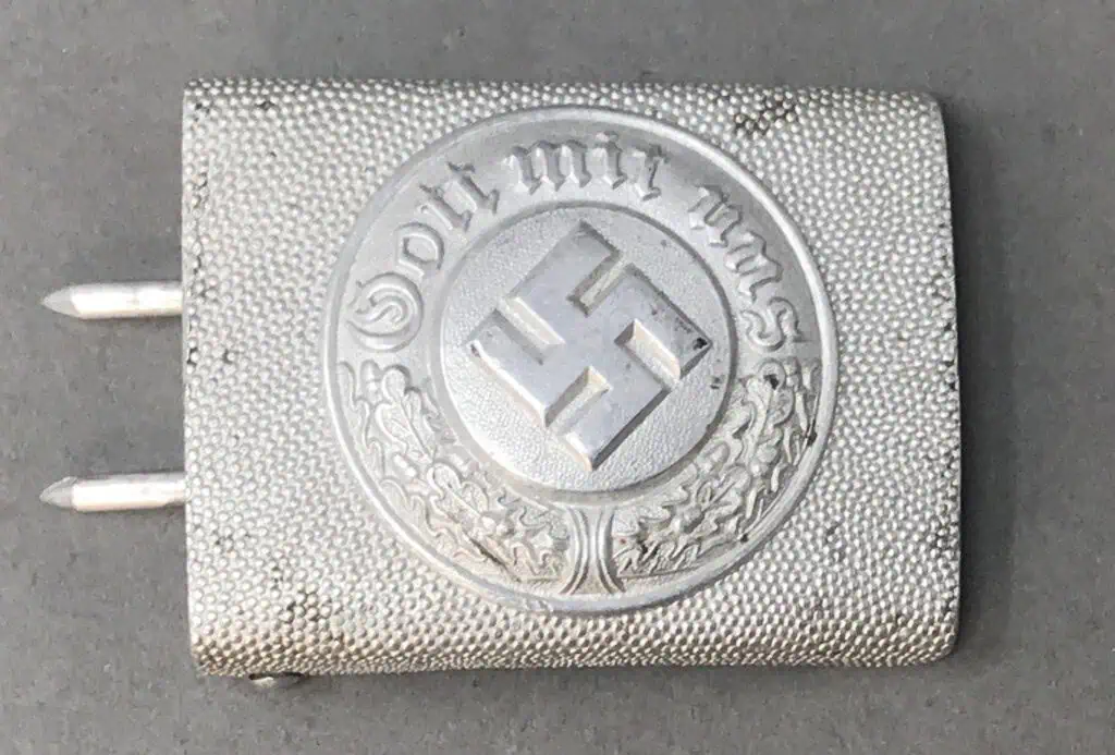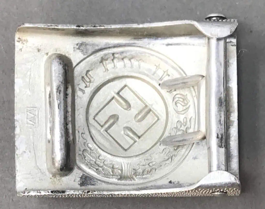 Original WWII German Police POLIZEI NCO’S BELT BUCKLE. (Koppelschloß) Certified. On June 17TH 1936, Reichsführer-SS Heinrich Himmler was appointed to the newly created position of Chef der Deutschen Polizei im Reichsministerium des Innern, (Chief of the German Police in the National Ministry of the Interior), effectively giving him full control of all police agencies within Germany. As a result of this appointment and the restructuring of all the separate German state police into a single national police force new regulations were instituted to bring about uniformity in dress for all police through-out the country. One of the new uniform regulations, was the introduction of two new style belt buckles on June 25TH 1936 with a round buckle for Officer’s ranks and a box buckle for NCO’s. Of Note: The German Police had no enlisted ranks with the lowest rank being an Unterwachtmeister which was equivalent to the German army rank of Unteroffizier. Also Of Note: This style of buckle was utilized for the duration of the war. Standardized, 1936 pattern, field gray overpainted, aluminum construction, police NCO’s, box belt buckle. The buckle features a pebbled base field with a central, circular, embossed, motif. The high relief, central, circular motif features a slightly textured background field with an embossed canted swastika, encompassed by a slightly textured circular field with an embossed, open topped oak-leaf wreath to the bottom and embossed Gothic script motto to the top, “Gott mit uns”, (God with us). The reverse of the buckle is a buckle catch, prong bar and prongs are all intact. nice untouched example. In good but used condition, brought home by a U.S. Veteran as a trophy of war. 100% Guaranteed to be authentic. Complete museum documentation (COA) Provided. Please see our other German Medals and Relics From WWII. Also note when browsing our web site there are several pages of items, at the bottom of the list look for other page numbers. OUTSTANDING MAKER MARKED EXAMPLE!! Don’t miss it!