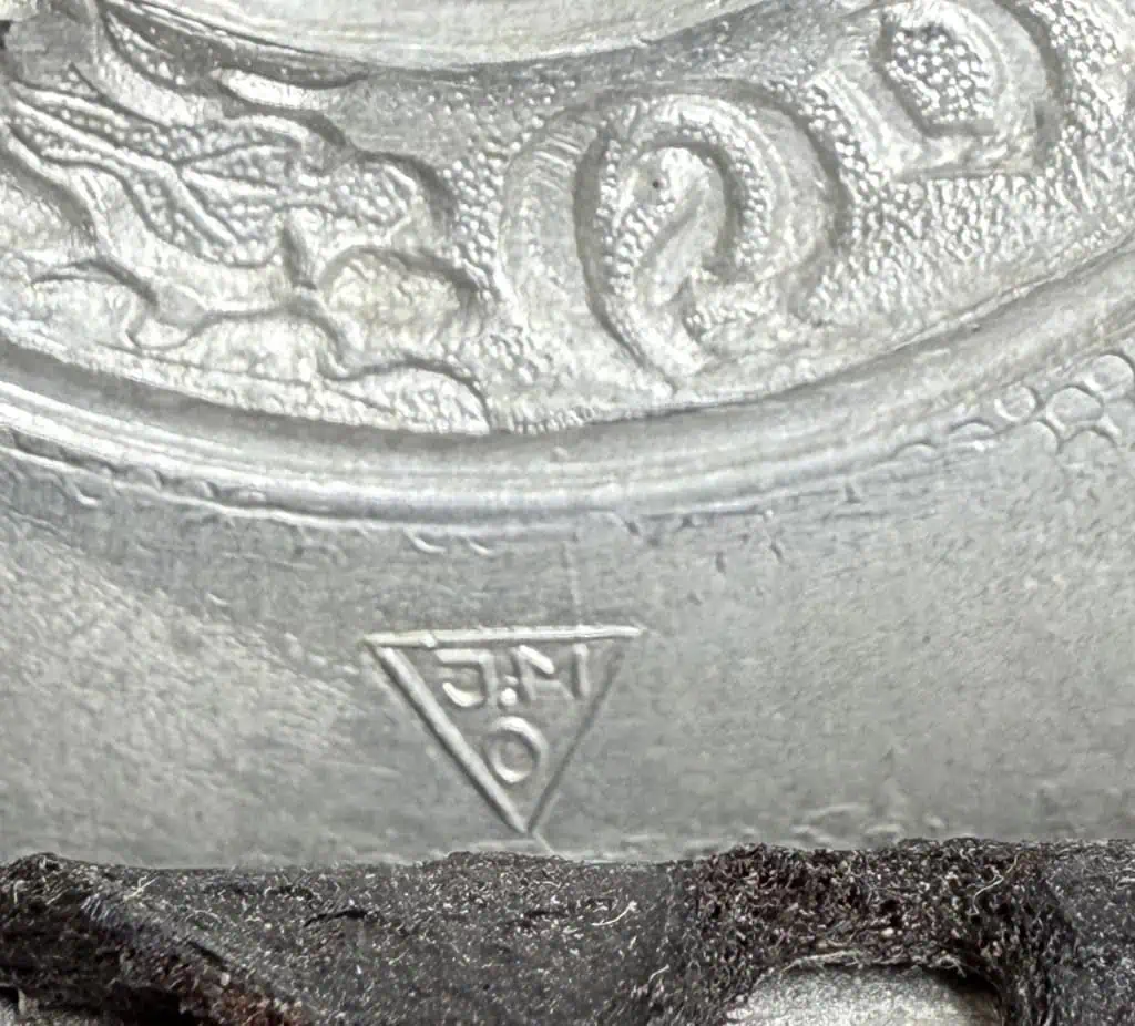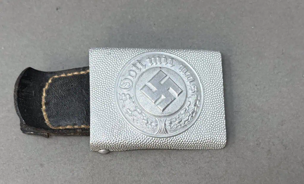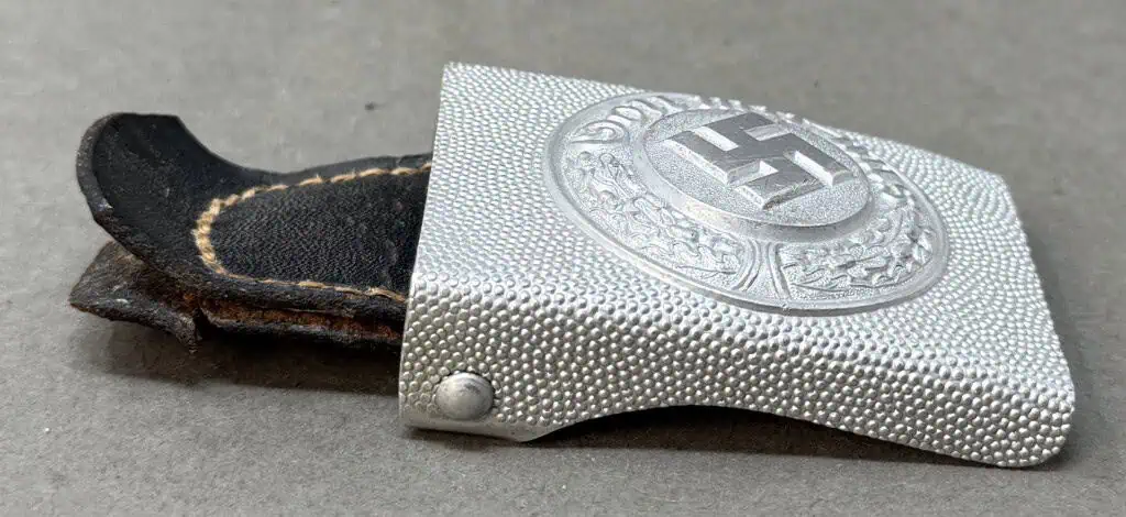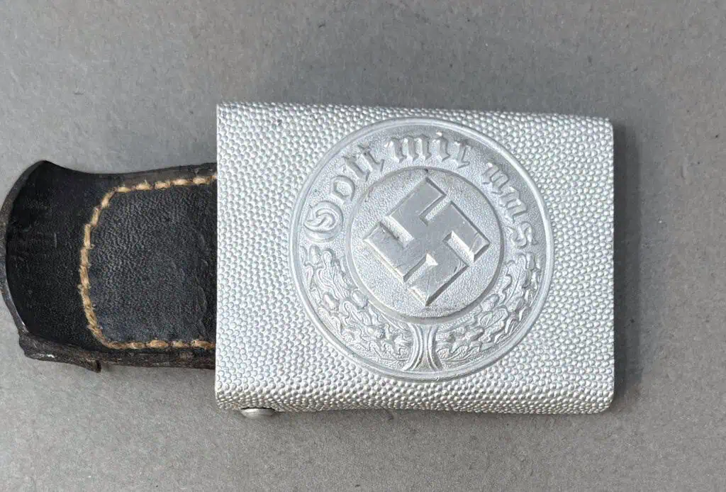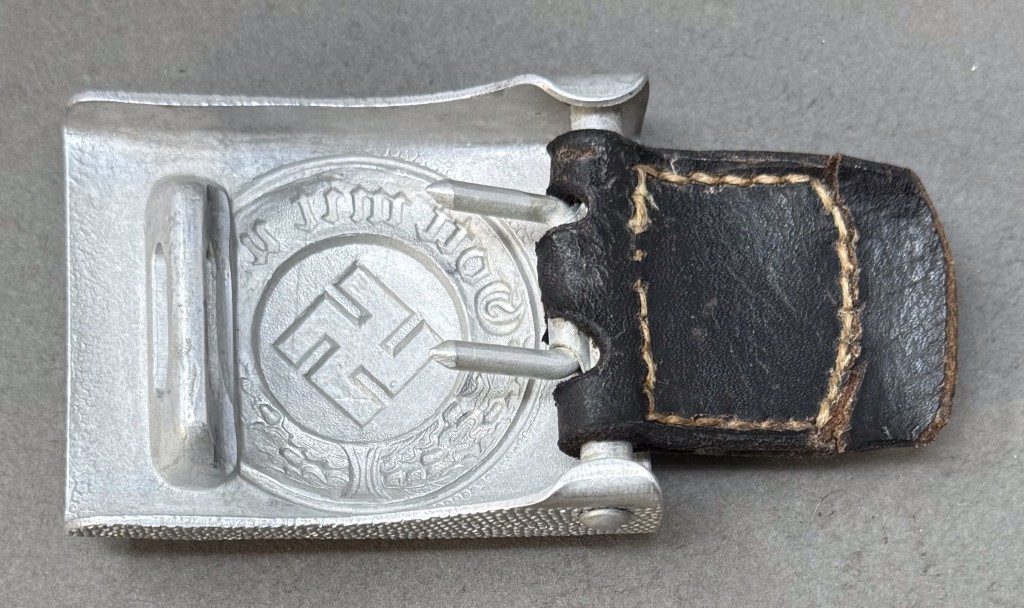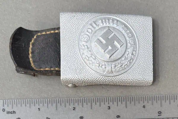 Original WWII German Police POLIZEI NCO’S BELT BUCKLE. (Koppelschloß) Certified. On June 17TH 1936, Reichsführer-SS Heinrich Himmler was appointed to the newly created position of Chef der Deutschen Polizei im Reichsministerium des Innern, (Chief of the German Police in the National Ministry of the Interior), effectively giving him full control of all police agencies within Germany. As a result of this appointment and the restructuring of all the separate German state police into a single national police force new regulations were instituted to bring about uniformity in dress for all police through-out the country. One of the new uniform regulations, was the introduction of two new style belt buckles on June 25TH 1936 with a round buckle for Officer’s ranks and a box buckle for NCO’s. Of Note: The German Police had no enlisted ranks with the lowest rank being an Unterwachtmeister which was equivalent to the German army rank of Unteroffizier. Also Of Note: This style of buckle was utilized for the duration of the war. Standardized, 1936 pattern, field gray overpainted, aluminum construction, police NCO’s, box belt buckle. The buckle features a pebbled base field with a central, circular, embossed, motif. The high relief, central, circular motif features a slightly textured background field with an embossed canted swastika, encompassed by a slightly textured circular field with an embossed, open topped oak-leaf wreath to the bottom and embossed Gothic script motto to the top, “Gott mit uns”, (God with us). The reverse of the buckle is a buckle catch, prong bar and prongs are all intact. Still has the original maker marked and 1941 dated leather tab! nice untouched example. In good but used condition, brought home by a U.S. Veteran as a trophy of war. 100% Guaranteed to be authentic. Complete museum documentation (COA) Provided. Please see our other German Medals and Relics From WWII.  Also note when browsing our web site there are several pages of items, at the bottom of the list look for other page numbers. OUTSTANDING EXAMPLE!!  Don’t miss it! Nicely maker marked with leather!! RARE WITH TAB!