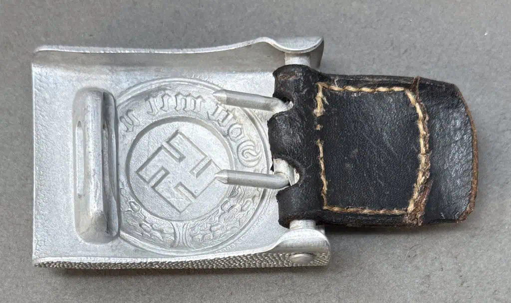 Original WWII German Police POLIZEI NCO’S BELT BUCKLE. (Koppelschloß) Certified. On June 17TH 1936, Reichsführer-SS Heinrich Himmler was appointed to the newly created position of Chef der Deutschen Polizei im Reichsministerium des Innern, (Chief of the German Police in the National Ministry of the Interior), effectively giving him full control of all police agencies within Germany. As a result of this appointment and the restructuring of all the separate German state police into a single national police force new regulations were instituted to bring about uniformity in dress for all police through-out the country. One of the new uniform regulations, was the introduction of two new style belt buckles on June 25TH 1936 with a round buckle for Officer’s ranks and a box buckle for NCO’s. Of Note: The German Police had no enlisted ranks with the lowest rank being an Unterwachtmeister which was equivalent to the German army rank of Unteroffizier. Also Of Note: This style of buckle was utilized for the duration of the war. Standardized, 1936 pattern, field gray overpainted, aluminum construction, police NCO’s, box belt buckle. The buckle features a pebbled base field with a central, circular, embossed, motif. The high relief, central, circular motif features a slightly textured background field with an embossed canted swastika, encompassed by a slightly textured circular field with an embossed, open topped oak-leaf wreath to the bottom and embossed Gothic script motto to the top, “Gott mit uns”, (God with us). The reverse of the buckle is a buckle catch, prong bar and prongs are all intact. Still has the original maker marked and 1941 dated leather tab! nice untouched example. In good but used condition, brought home by a U.S. Veteran as a trophy of war. 100% Guaranteed to be authentic. Complete museum documentation (COA) Provided. Please see our other German Medals and Relics From WWII. Also note when browsing our web site there are several pages of items, at the bottom of the list look for other page numbers. OUTSTANDING EXAMPLE!! Don’t miss it! Nicely maker marked with leather!! RARE WITH TAB!