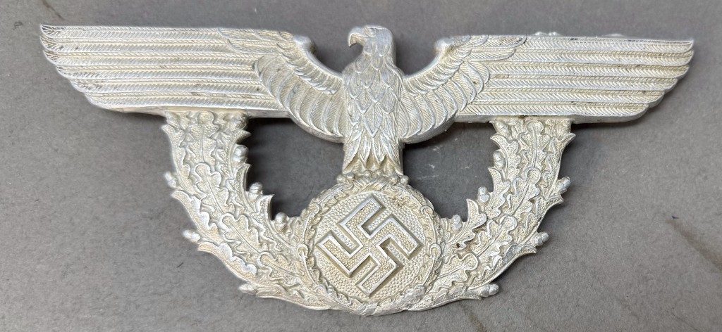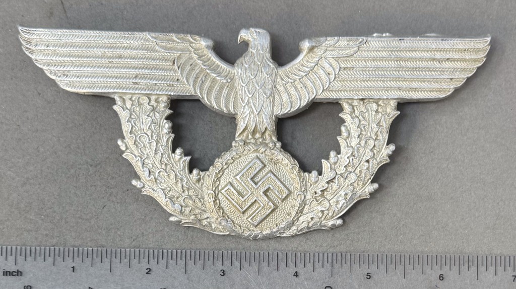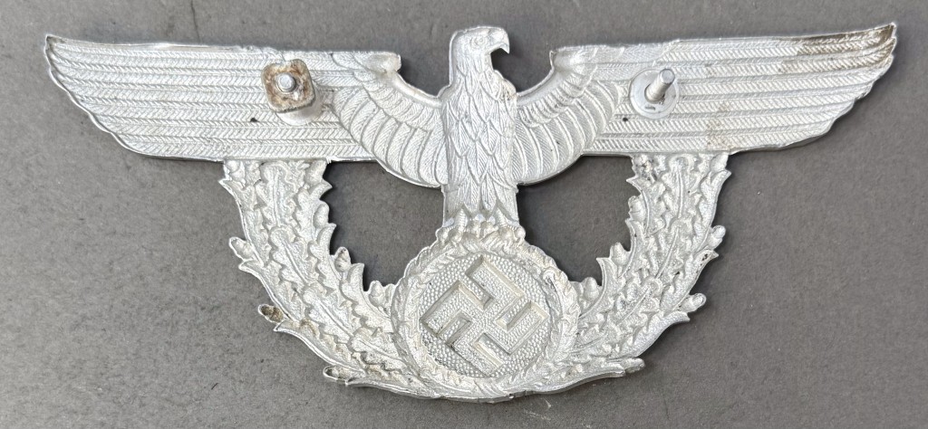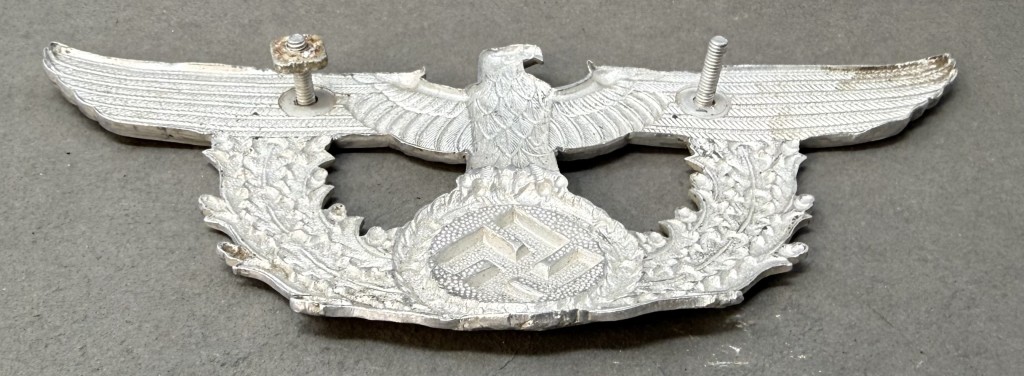 Original WWII German Police POLIZEI NCO’S SHAKO EAGLE. (Tschako Adler)  Certified. Dress regulations introduced a slightly modified version of the Shako for wear by all civil police personnel with minor variations. When worn the Shako was outfitted with a new style national eagle and swastika. Of Note: The first pattern police eagle and swastika was originally introduced on April 23RD 1934 and a slightly modified, second pattern, police eagle and swastika was introduced on June 25TH 1936 to replace the first pattern. Second pattern, (Circa June 1936-May 1945), single piece, silver washed, die stamped zinc alloy, construction, right facing eagle features out-stretched wings, clutching a wreathed, canted swastika in it’s talons and is superimposed on a vertically oval, opened top, oak-leaf wreath with the eagles wings extending beyond the outer edges of the wreath. The hollow backed reverse is a mirror image of the obverse and has both of the two inset, soldered, screw threaded attachment prongs  Gettysburg Museum Certified (COA) provided. 100% Guaranteed to be authentic. Sold for historic purposes only. See our other pieces on our web site.  Also note when browsing our web site there are several pages of items, at the bottom of the list look for other page numbers. DO NOT MISS IT! GREAT LOOKING EAGLE!