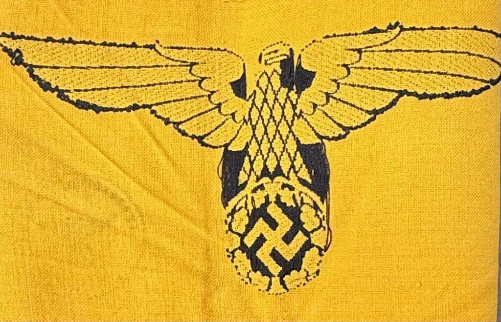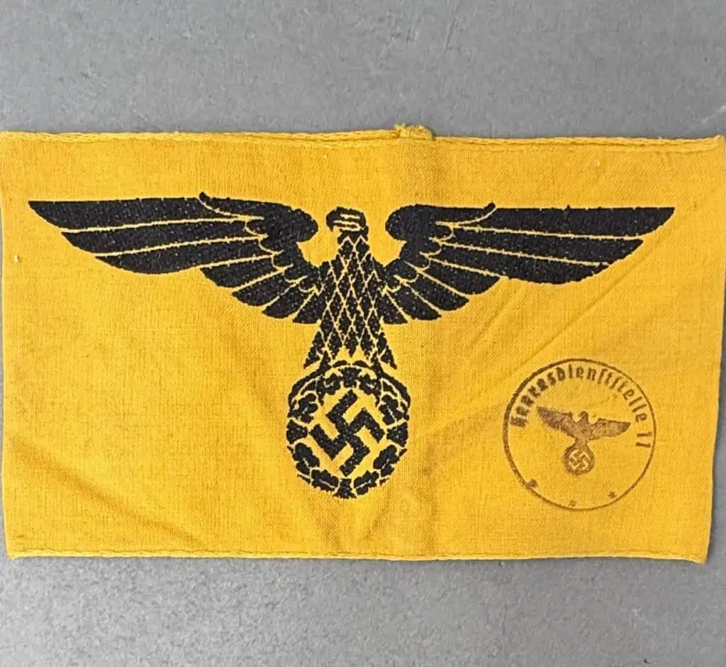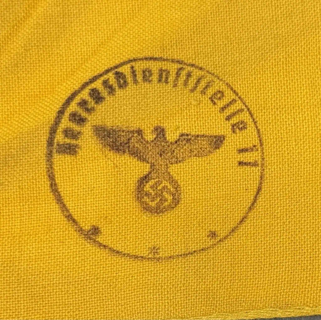 Original WWII German Service OF THE ARMED FORCES ARMBAND. (Nicht-Wehrmachtangehörige Ärmelbinde) With Event Stamp Certified. The Army Mobilization Order of March 12TH 1937 introduced a wide variety of armbands that were worn to identify personnel performing specific duties or functions for the Armed Forces. Most of the armbands were worn on the upper left sleeve of uniformed or non-uniformed personnel and were worn only while the individual was performing the specific duty or function identified by the armband. The “Nicht-Wehrmachtangehörige”, (Non-Members of the Armed Forces), armband was one of the armbands introduced with the Army Mobilization Order of March 12TH 1937 and was designed for wear by combatants who were not members of the Armed Forces. Woven golden yellow cotton construction armband with a black, machine woven, stylized national eagle with out-stretched wings, clutching a wreathed, canted swastika in its talons to the obverse center. The top and bottom edges of the armband have interwoven rows of reinforcement stitching and the reverse of the armband has a machine stitched, vertical, seam. In good (almost mint) Condition. Has a faded event stamp (see photos). Complete museum documentation (COA) Provided. Certified by The Gettysburg Museum of History. The Gettysburg Museum of History does not support or condone Adolf Hitler, or the Nazi Party and is only offering this as a historic relic. Please see our other items. Also note when browsing our web site there are several pages of items, at the bottom of the list look for other page numbers.