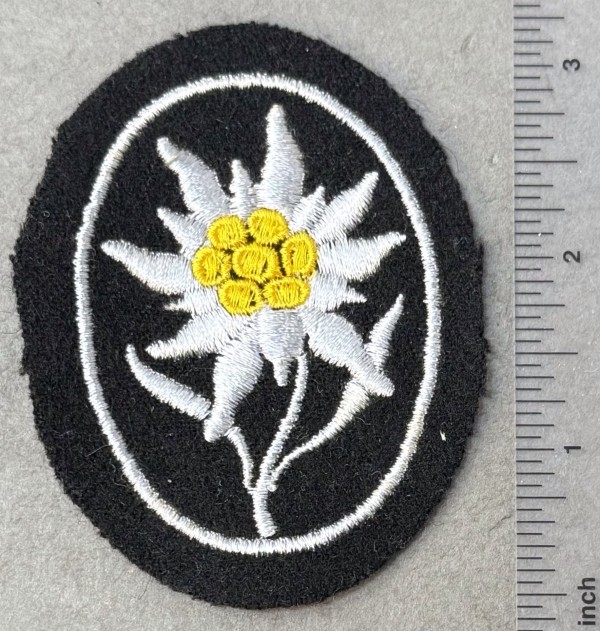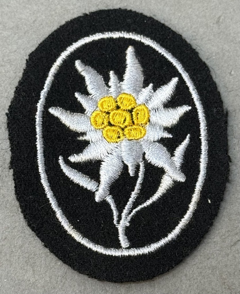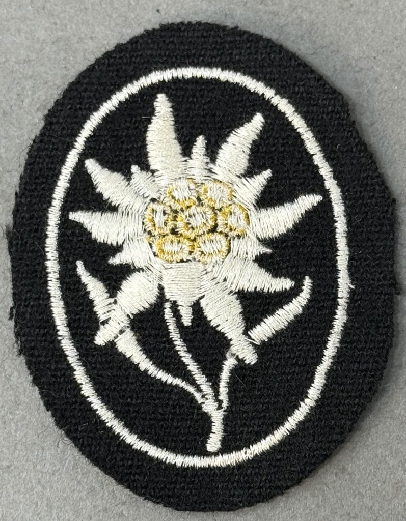 Original WWII German Waffen SS MOUNTAIN TROOP’S SLEEVE EDELWEISS. (SS Ärmel Edelweiss für Gebirgsjäger) Certified. During WWII the German army fielded nine Mountain Divisions with an additional six Waffen-SS, (Armed-SS), Mountain Divisions. Generally speaking, the Mountain Divisions were specially trained and equipped Infantry Divisions. On October 1ST 1943 Waffen-SS personnel serving with Mountain troop units were authorized wear of the traditional Edelweiss as an identifying insignia. The Edelweiss insignia was issued in two forms with one designed for wear on the left side of the Bergmütze, (Mountain cap), and another design for wear on the upper right sleeve of the greatcoat and tunic. The design of these badges closely followed the pattern of the earlier introduced, (May 2ND 1939), army Edelweiss badges. Of Note: The only differences between the army and the SS Edelweiss sleeve badges were the coloration and the army style Edelweiss had a simulated mountaineer’s rope with piton as opposed to the SS straight oval ring border. Black wool base with a machine embroidered Edelweiss with fourteen, irregular, silver/grey petals, a seven bulb, yellow stamen and dual silver/grey leaves and a stem all in rayon threads. The Edelweiss is encompassed by a fine, machine embroidered, silver/grey cotton, oval outer border stripe. 100% guaranteed to be authentic with Museum COA (Certificate Of Authenticity). one of the desirable artifacts from the Third Reich. DO NOT MISS THIS! GOOD EXAMPLE! SS Items are RARE! From a recent Dachau grouping we obtained (recovered at Dachau Concentration camp by a U.S. Veteran.