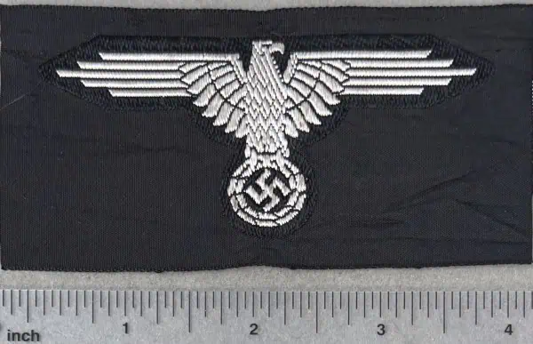 Original WWII German Waffen SS NCO/OFFICER’S SLEEVE EAGLE. (SS-Ärmelhoheitsabzeichen) Certified.  The Allgemeine-SS, (General-SS), was originally formed in May 1923 as the Stosstrupp Adolf Hitler (Shock Troops Adolf Hitler), and was redesignated Schutzstaffel, (Protection Squad), in April 1925 with the official acceptance of the name verified on the second anniversary of the failed Munich “Beer-Hall” Putsch on November 9TH 1925. On January 6TH 1929 Heinrich Himmler was appointed as Reichsführer-SS, (National Leader {of the} SS), and on July 20TH 1934 shortly after the, June 30TH 1934, purge of the SA, Sturm Abteilung, (Storm Troopers) on the “Night of the Long Knives”, the SS was rewarded by Hitler by being granted the status of an independent organization under direct control of the NSDAP, Nationalsozialistische Deutsche Arbeiterpartei, (National Socialist German Worker’s Party). The first pattern SS sleeve eagle was officially introduced in May 1936 although photographic evidence indicates that it was in use as early as the summer of 1935. Shortly after its official introduction the eagle underwent minor modifications resulting in the second pattern that was worn for the duration of the war. These second pattern eagles were originally issued in a hand embroidered version for Officers ranks and a machine embroidered version for EM/NCO’s until a machine woven version was introduced in 1939. Of Note: The RZM, Reichzeugmeisterei, (National Equipment Quartermaster), was official founded in June 1934 in Munich by the NSDAP as a Reich Hauptamt, (State Central Office), and was based on the earlier SA Quartermaster’s Department. The functions of the RZM were not only to procure and distribute items to Party formations, including the SS, but also to approve chosen designs and to act as a quality control supervisor to ensure items manufactured for the Party met required specification and were standardized. Starting in late 1934 items manufactured for the SS came under the quality control of the RZM and were marked with an RZM/SS approval tag. In 1943 the Waffen-SS assumed full control over their uniform item production and no longer fell under the authority of the RZM. Second pattern, (Circa 1939-1945), machine woven SS sleeve eagle with out-stretched wings, clutching a wreathed, canted, swastika in it’s talons in silver threads on a woven, black, rayon base. Hard eagle to find & near mint! These are the type that came out of Dachau Concentration camp!  100% guaranteed to be authentic with Museum COA (Certificate Of Authenticity). This SS eagle   is one of the desirable artifacts from the Third Reich.   DO NOT MISS THIS! OUTSTANDING  EXAMPLE! SS Items  are RARE and desirable to collectors and historians! From a recent grouping that came from Dachau!
