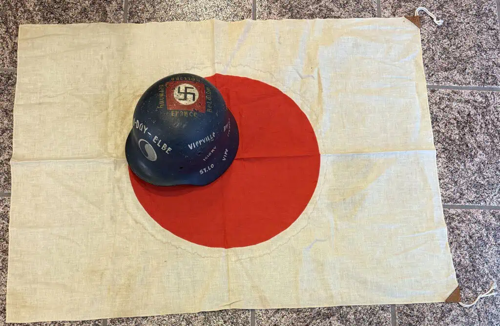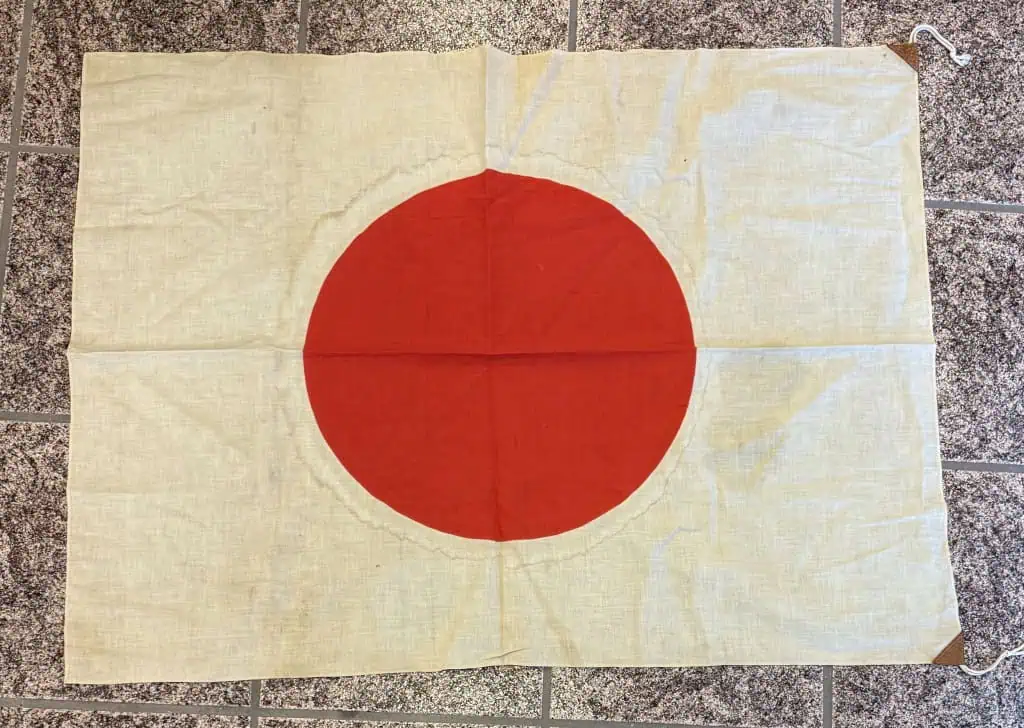 Original WWII Japanese NATIONAL FLAG WITH Brought Home By A U.S. Veteran Certified. Most Japanese troops during the second world war carried a personal flag. They had practical as well as patriotic uses, such as marking positions to keep them safe from friendly aircraft while advancing. One piece cotton example is 68cm x 52cm. An approximately 22cm diameter red “Himaru” is screened to the center of the flag’s white field. We placed a helmet on the flag for size reference. Shows the expected age and use. 100% Guaranteed to be authentic and is certified by The Gettysburg Museum Of History and comes with our Museum COA (certificate of authenticity). A rare piece of WWII history. DO NOT MISS THIS! , excellent condition has a small period staining