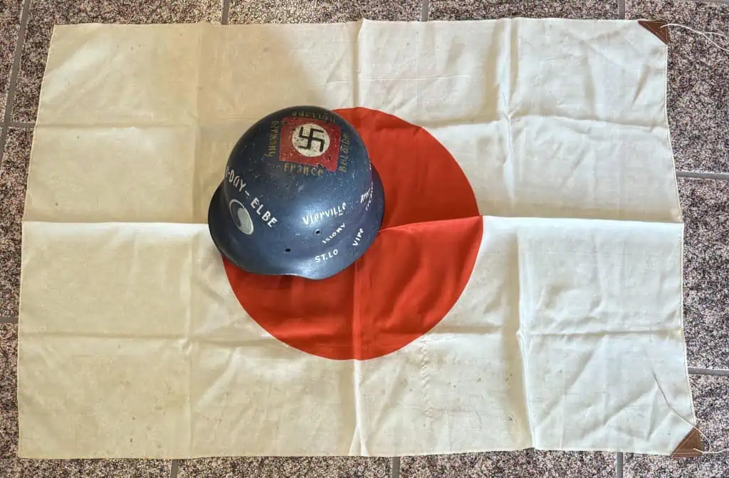 Original WWII Japanese NATIONAL FLAG WITH Brought Home By A U.S. Veteran Certified. Most Japanese troops during the second world war carried a personal flag. They had practical as well as patriotic uses, such as marking positions to keep them safe from friendly aircraft while advancing. One piece cotton example is 68cm x 52cm. An approximately 22cm diameter red “Himaru” is screened to the center of the flag’s white field. We placed a helmet on the flag for size reference. Shows the expected age and use. 100% Guaranteed to be authentic and is certified by The Gettysburg Museum Of History and comes with our Museum COA (certificate of authenticity). A rare piece of WWII history. DO NOT MISS THIS! , excellent condition has a small period staining