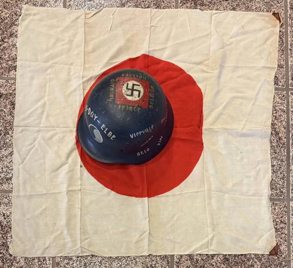 Original WWII Japanese NATIONAL FLAG WITH Brought Home By A U.S. Veteran Certified. Most Japanese troops during the second world war carried a personal flag. They had practical as well as patriotic uses, such as marking positions to keep them safe from friendly aircraft while advancing. One piece cotton example is 68cm x 52cm. An approximately 22cm diameter red “Himaru” is screened to the center of the flag’s white field. We placed a helmet on the flag for size reference. Shows the expected age and use.  100% Guaranteed to be authentic and is certified by The Gettysburg Museum Of History and comes with our Museum COA (certificate of authenticity). A rare piece of WWII history. DO NOT MISS THIS! , excellent condition has a small period staining a few pin holes.