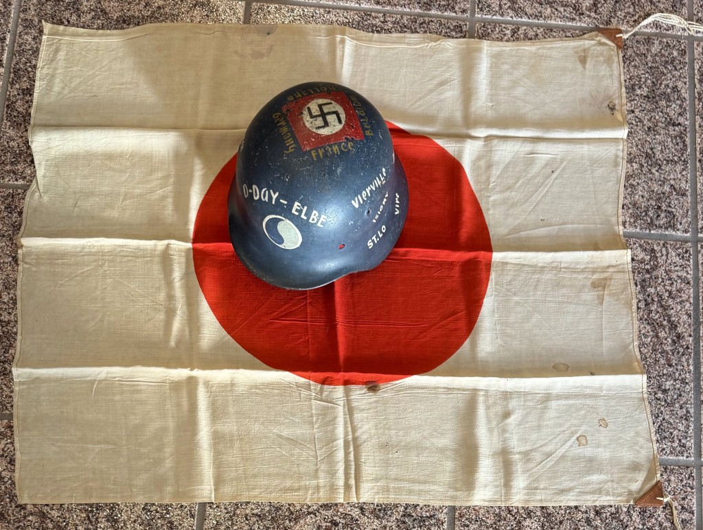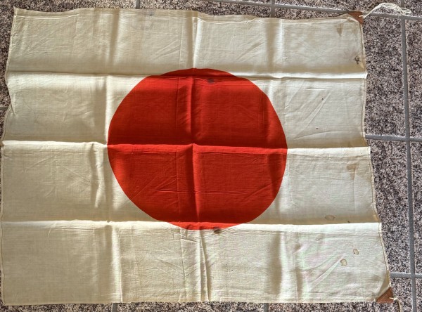 Original WWII Japanese NATIONAL FLAG WITH Brought Home By A U.S. Veteran Certified. Most Japanese troops during the second world war carried a personal flag. They had practical as well as patriotic uses, such as marking positions to keep them safe from friendly aircraft while advancing. One piece cotton example is 68cm x 52cm. An approximately 22cm diameter red “Himaru” is screened to the center of the flag’s white field. We placed a helmet on the flag for size reference. Shows the expected age and use. 100% Guaranteed to be authentic and is certified by The Gettysburg Museum Of History and comes with our Museum COA (certificate of authenticity). A rare piece of WWII history. DO NOT MISS THIS! , good used condition has a small period staining a few pin holes.