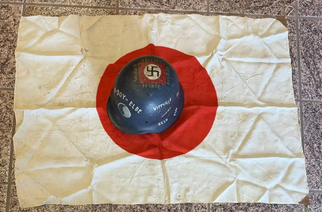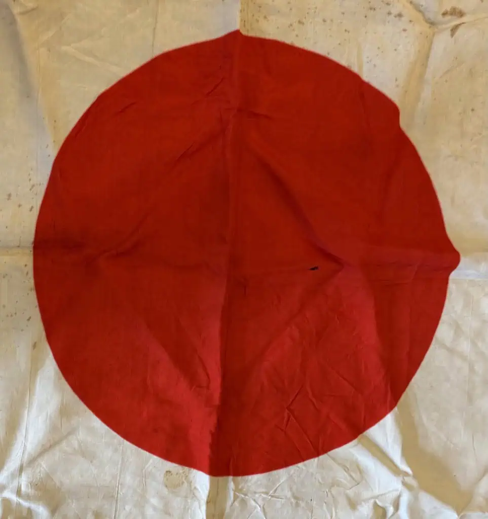 Original WWII Japanese NATIONAL FLAG WITH Brought Home By A U.S. Veteran Certified. Most Japanese troops during the second world war carried a personal flag. They had practical as well as patriotic uses, such as marking positions to keep them safe from friendly aircraft while advancing. One piece cotton example is 68cm x 52cm. An approximately 22cm diameter red “Himaru” is screened to the center of the flag’s white field. We placed a helmet on the flag for size reference. Shows the expected age and use. 100% Guaranteed to be authentic and is certified by The Gettysburg Museum Of History and comes with our Museum COA (certificate of authenticity). A rare piece of WWII history. DO NOT MISS THIS! , good used condition has a small period staining a few pin holes.