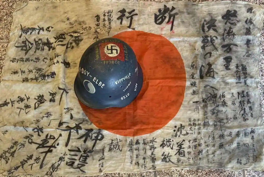 Original WWII Japanese NATIONAL FLAG WITH KANJI And Brought Home By A U.S. Veteran Certified. Most Japanese troops during the second world war carried a personal flag. They had practical as well as patriotic uses, such as marking positions to keep them safe from friendly aircraft while advancing. One piece example is 28cm x 38cm. An approximately 12cm diameter red “Himaru” is screened to the center of the flag’s white field. Handwritten, in black, around the Himaru and on the Himaru are numerous kanji characters. We placed a helmet on it for size reference. A very interesting flag. Shows the expected age and use (see photos) in good used condition and it’s very displayable and could be framed and it would look nice. 100% Guaranteed to be authentic and is certified by The Gettysburg Museum Of History and comes with our Museum COA (certificate of authenticity). A rare piece of WWII history. DO NOT MISS THIS! OUTSTANDING EXAMPLE!