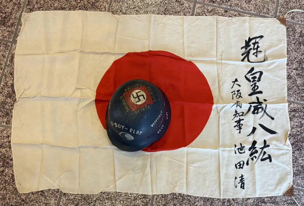 Original WWII Japanese NATIONAL FLAG WITH KANJI And Brought Home By A U.S. Veteran Certified. Most Japanese troops during the second world war carried a personal flag. They had practical as well as patriotic uses, such as marking positions to keep them safe from friendly aircraft while advancing. One piece example is 28cm x 38cm. An approximately 12cm diameter red “Himaru” is screened to the center of the flag’s white field. Handwritten, in black, around the Himaru and on the Himaru are numerous kanji characters. ! We placed a helmet on it for size reference. A very interesting flag. Shows the expected age and use (see photos) in good condition a few minor spots otherwise good condition and it’s very displayable and could be framed and it would look nice. 100% Guaranteed to be authentic and is certified by The Gettysburg Museum Of History and comes with our Museum COA (certificate of authenticity). A rare piece of WWII history. Hs a google translate lens translation on one photo. NICE EXAMPLE DO NOT MISS THIS!