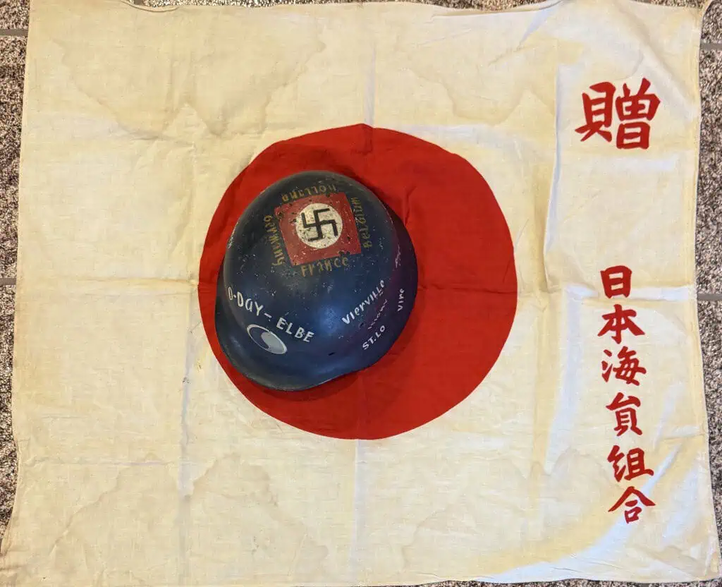 Original WWII Japanese NATIONAL FLAG WITH Brought Home By A U.S. Veteran Certified. Most Japanese troops during the second world war carried a personal flag. They had practical as well as patriotic uses, such as marking positions to keep them safe from friendly aircraft while advancing. One piece cotton example is 68cm x 52cm. An approximately 22cm diameter red “Himaru” is screened to the center of the flag’s white field. HAS VERY RARE Screened Kanji message (see Photos) We placed a helmet on the flag for size reference. Shows the expected age and use. 100% Guaranteed to be authentic and is certified by The Gettysburg Museum Of History and comes with our Museum COA (certificate of authenticity). A rare piece of WWII history. DO NOT MISS THIS! , good used condition has a small period mild staining