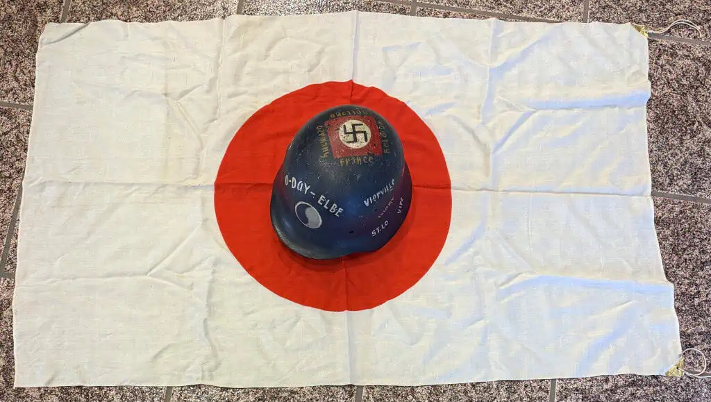 Original WWII Japanese NATIONAL FLAG WITH Brought Home By A U.S. Veteran Certified. Most Japanese troops during the second world war carried a personal flag. They had practical as well as patriotic uses, such as marking positions to keep them safe from friendly aircraft while advancing. One piece cotton example is 68cm x 52cm. An approximately 22cm diameter red “Himaru” is screened to the center of the flag’s white field. We placed a helmet on the flag for size reference. Shows the expected age and use.  100% Guaranteed to be authentic and is certified by The Gettysburg Museum Of History and comes with our Museum COA (certificate of authenticity). A rare piece of WWII history. DO NOT MISS THIS! , excellent condition