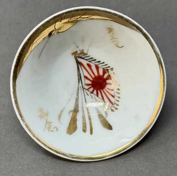 Original WWII Japanese Patriotic Saki Cup Certified. A white porcelain construction, gilt rimmed, sake cup with gilt painted flag, and gilt kanji, that has a raised bottom. The cup has a diameter of 10cm. Good used condition with some storage wear 100% Guaranteed to be authentic and is certified by The Gettysburg Museum Of History and comes with our Museum COA (certificate of authenticity). A rare piece of WWII history. outstanding! DO NOT MISS THIS!