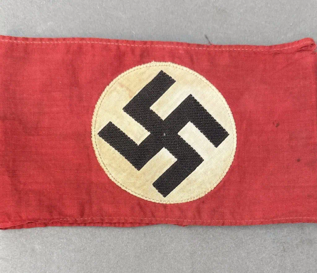 Original WWII Nazi German Multi-piece Construction Armband Brought Home By A U.S. Veteran. A U.S. vet bring back in good used condition. Some light wear from storage.  Deluxe version of the Nazi Arm Band.  The most recognizable pieces of insignia associated with the Nazi regime is the swastika armband. Utilized by pretty much by all the organization of the Third Reich in one form or another. The swastika, (a Sanskrit word meaning “well-being”), is an ancient symbol that was utilized in numerous diverse cultures and signified both the cycle of life and the sun. The swastika was also a Nordic rune and the pagan Germanic symbol for Thor, God of Adventurers.   A high-quality cotton cloth materiel. approximately 9cm diameter separate piece sewn white disk, and super high-quality bevo woven swastika (SEE PHOTOS) A nice quality example. A very good earlier example. Gettysburg Museum Certified (COA) provided. Rare 100% Guaranteed to be authentic. Some mild staining (see photos) Brought home by a U.S Veteran as a trophy of war. Sold for historic purposes only. See our other pieces on our web site.  Also note when browsing our web site there are several pages of items, at the bottom of the list look for other page numbers. You wanted the best this is it. Do not miss this one!  Armbands and are in HIGH DEMAND! Don’t Miss it!  NICE  EXAMPLE!