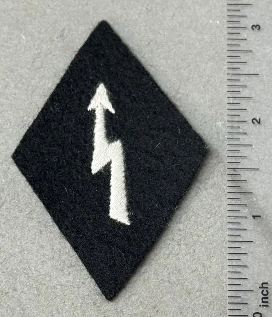 Original WWII Waffen SS EM/NCO’S SIGNALS SLEEVE DIAMOND. (Nachrichtenpersonal Ärmelabzeichen) Certified. The wearing of specific, identifying, trade or speciality badges was an old tradition in the German army and was adopted by the Waffen-SS, (Armed-SS), to distinguish personnel who had successful completed the appropriate course and had achieved proficiency at a particular trade, specialty or function. Initially Waffen-SS personnel wore the circular army pattern insignia, but eventually developed their own diamond patterned insignia. The SS pattern insignia consisted of a black wool diamond base with silver/aluminum thread emblems for all personnel for wear on the black service uniform. With the introduction of the field-grey uniform all ranks were to wear the insignia done in silver/grey threads and the silver/aluminum versions were to be worn only by Officers ranks with the walking-out dress. The trade/specialty insignia was to be worn on the lower left sleeve of the field blouse and the service tunic by qualified personnel and this example indicates a qualified Signals EM/NCO. Of Note: The RZM, Reichzeugmeisterei, (National Equipment Quartermaster), was officially founded in June 1934 in Munich by the Nationalsozialistische Deutsche Arbeiterpartei, (National Socialist German Worker’s Party), as a Reich Hauptamt, (State Central Office), and was based on the earlier SA ,Sturm Abteilung, (Storm/Assault Detachment), Quartermaster’s Department. The functions of the RZM were not only to procure and distribute items to Party formations, but also to approve chosen designs and to act as a quality control supervisor to ensure items manufactured for the Party met required specification and were standardized. Starting in late 1934 items manufactured for the SS came under the quality control of the RZM and were marked with a RZM/SS approval/acceptance tags. In 1943 the Waffen-SS assumed full control over their uniform item production and no longer fell under the authority of the RZM. Roughly, 70mm tall, 45mm wide, vertical, black wool diamond base featuring a machine embroidered, downward pointing, “blitz” arrow in silvery/grey rayon threads. The reverse of the insignia has a semi-translucent, glue like protective backing mostly intact. Excellent untouched example.  Nice used example showing the expected age  (see photos) almost mint. 100% Guaranteed to be authentic Brought home by a U.S. solider as a trophy of war. SS items are very collectible and difficult to find in good condition. Complete museum documentation (COA) Provided. Certified by The Gettysburg Museum of History. The Gettysburg Museum of History does not support or condone Adolf Hitler or the Nazi Party and is only offering this as a historic relic. Please see our other items. Also note when browsing our web site there are several pages of items, at the bottom of the list look for other page numbers. A RARE SS Insignia!