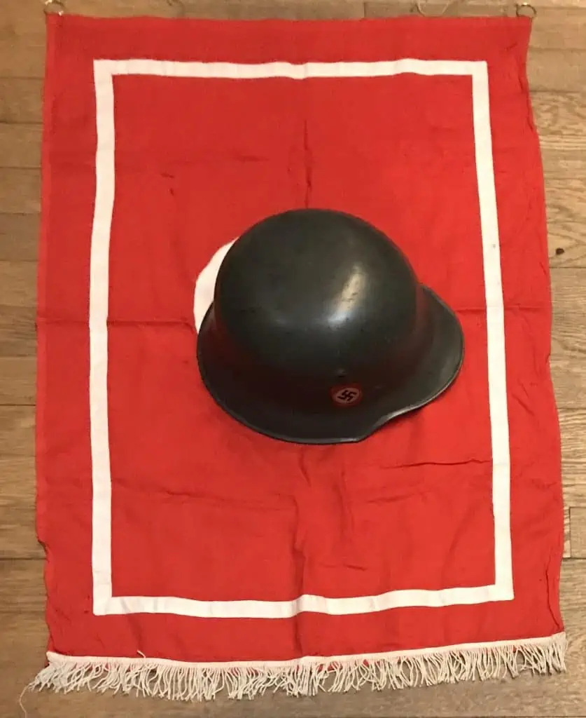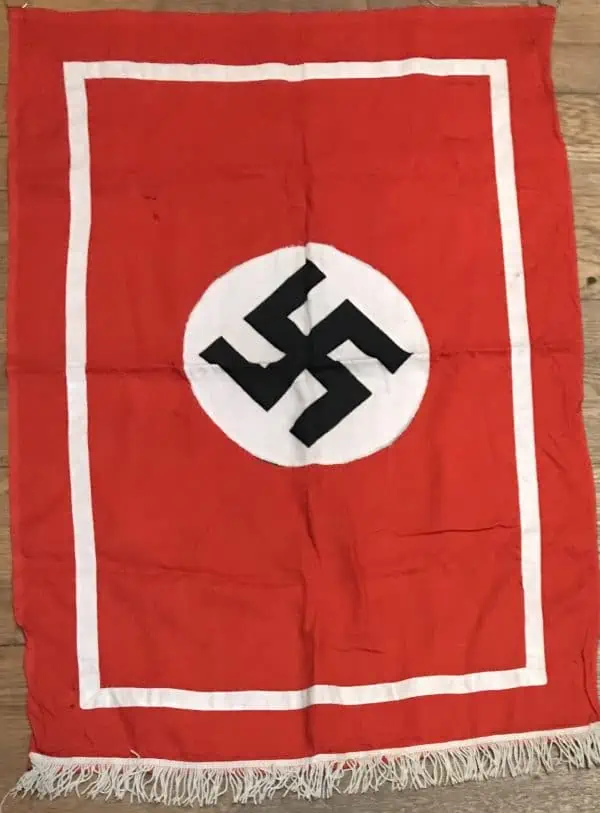 Original WWII Era German Nazi Party Podium Flag Certified. A standard style Cloth banner (Podium Style) type flag. Utilized by pretty much by all the organization of the Third Reich in one form or another. The swastika, (a Sanskrit word meaning “well-being”), is an ancient symbol that was utilized in numerous diverse cultures and signified both the cycle of life and the sun. The swastika was also a Nordic rune and the pagan Germanic symbol for Thor, God of Adventurers. In good condition single sided 31″/42″!!! standard cotton bunting style material with separate sewn white disk and HIGH QUALITY MUTI-PIECE swastika. It has a white cloth stripe around the edge. Also has a white fringe at the bottom. We placed a helmet on the flag for size reference. It has one of the two hanging loops still intact (see photos) A fantastic piece of WWII history. good condition (ALMOST MINT) with Very minor storage wear no fading (see photos) almost mint and very clean a few storage scuffs but very clean. This flag is A good quality version and one of the better sizes for the most discriminating and cultivated collector. it Overall a very collectible flag with lots of history nice period used flag captured by a U.S. Veteran and brought home as a war trophy. Nice used example showing the expected age 100% Guaranteed to be authentic Brought home by a solider as a trophy of war. A very desirable size in good condition an outstanding example. Don’t miss this one! RARE in this size. Complete museum documentation (COA) Provided. Certified by The Gettysburg Museum of History. The Gettysburg Museum of History does not support or condone Adolf Hitler or the Nazi Party and is only offering this as a historic relic. Please see our other items. Also note when browsing our web site there are several pages of items, at the bottom of the list look for other page numbers. RARE IN THIS SIZE. OUTSTANDING EXAMPLE! NSDAP FLAGS ARE GETTING TOUGHER TO FIND! Don’t Miss It!!!! RARE, CLEAN, example. Nice displayable size! Very Mint example! IF YOU WANT THE BEST THIS IS IT!