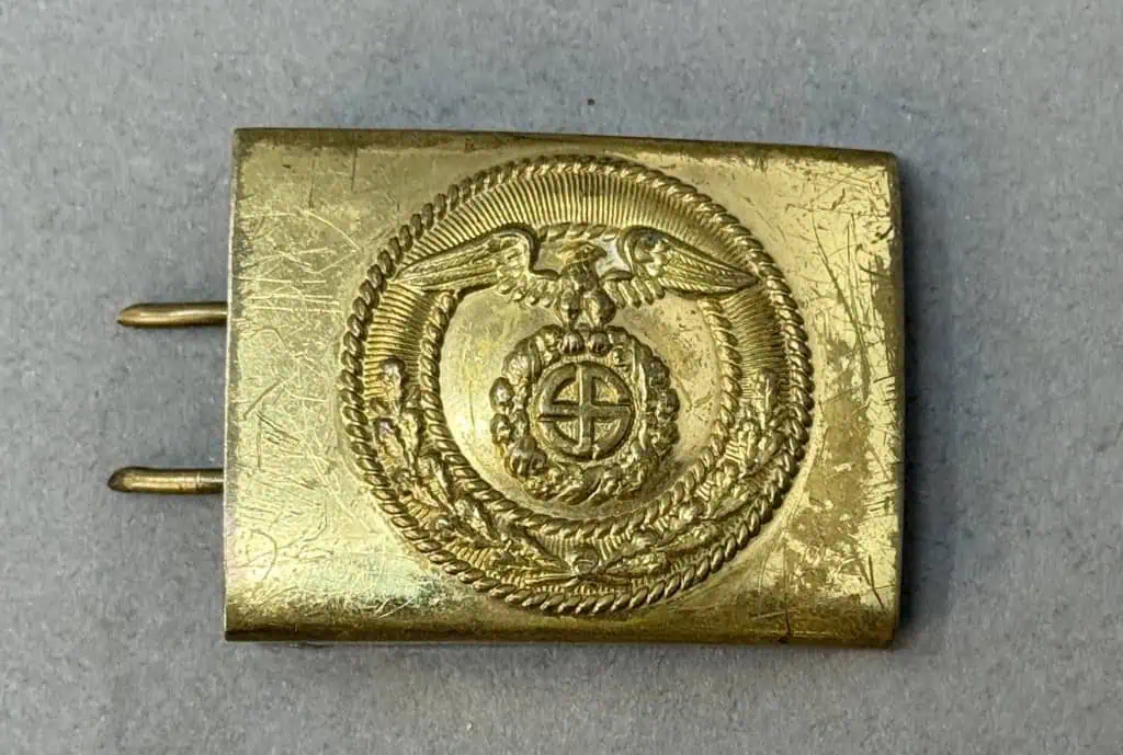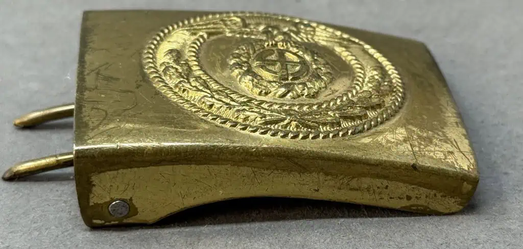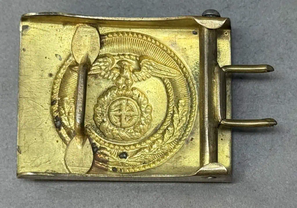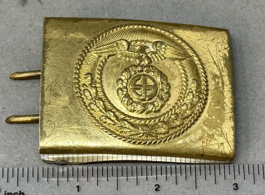 Original German NSDAP (NAZI PARTY) BROWNSHIRTS SA EM/NCO’S BELT BUCKLE. (Koppelschloß) Certified. The SA, “Sturmabteilung” (Storm-troops), were originally formed in August of 1921 as a protective guard unit for the political leaders of the fledgling Nazi Party. As with the NSDAP, “Nationalsozialistische Deutsche Arbeiterpartei” (National-socialist German Worker’s-party), the SA was structured along para-military lines. Most of its recruits were from the ranks of the various “Freikorps” groups of the day, composed mainly of disgruntled ex-soldiers, and they were first utilized at a Nazi party meeting in Munich in November of 1921. The SA pattern box buckle was the first belt buckle to be introduced by the NSDAP, with its estimated introductory dates ranging between 1921 and 1923. On its introduction it was not fully standardized and came in at least five variations. The SA pattern buckle was originally worn by other Nazi organizations including the SS, the NSKK, the NSBO, and political leaders. The SA box buckle was officially replaced by the rectangular, open frame, dual claw buckle in April of 1934, and was to be discontinued in 1936, although it was still widely worn. The 65mm x 50mm, slightly convex, stamped brass, two-piece construction buckle features, to its obverse, a plain field upon which is an embossed, political-style national eagle clutching the laurel surround to a RARE EARLY “SUNDIAL” style swastika on a slightly domed, plain field. The eagle’s head falls on the inside of a ribbed border with simulated twisted rope trim to its inner and outer edges. The ribbed border, which is 42mm in outside diameter, has a spray of oak leaves to its base, with the eagle’s wings extending into it at the top. To the reverse is its raised buckle catch, and a prong bar with dual prongs, for the belt’s retaining tongue. Unmarked. 100% Guaranteed to be authentic Brought home by a U.S. solider as a trophy of war. Complete museum documentation (COA) Provided. Certified by The Gettysburg Museum of History. The Gettysburg Museum of History does not support or condone Adolf Hitler or the Nazi Party and is only offering this as a historic relic. Please see our other items. Also note when browsing our web site there are several pages of items, at the bottom of the list look for other page numbers. EARLY VERSION! Don’t Miss It! Classic SA Belt Buckle!