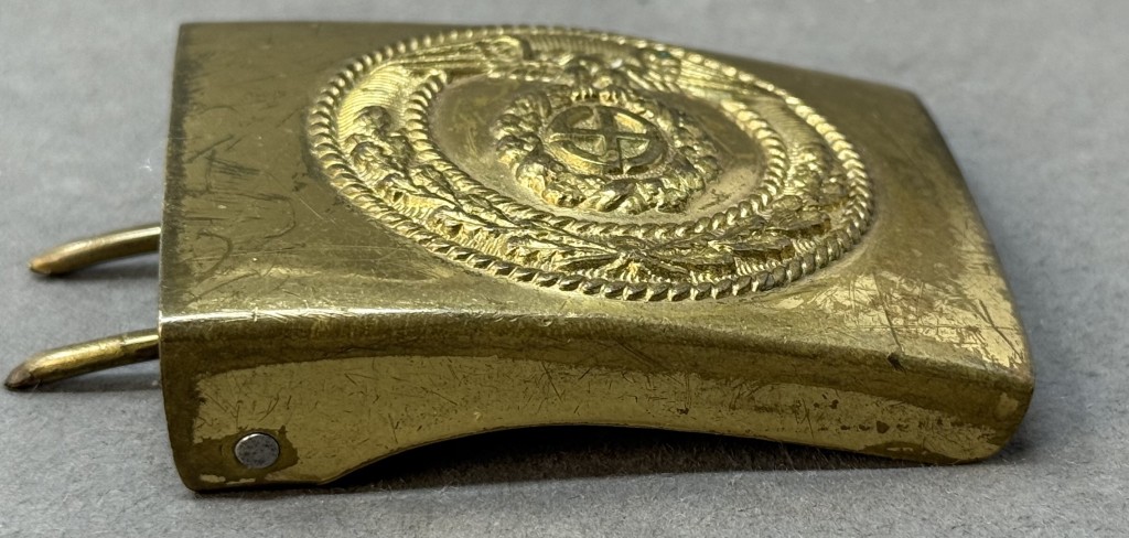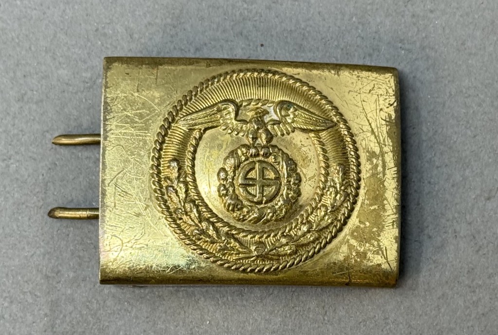 Original German NSDAP (NAZI PARTY) BROWNSHIRTS SA EM/NCO’S BELT BUCKLE. (Koppelschloß) Certified. The SA, “Sturmabteilung” (Storm-troops), were originally formed in August of 1921 as a protective guard unit for the political leaders of the fledgling Nazi Party. As with the NSDAP, “Nationalsozialistische Deutsche Arbeiterpartei” (National-socialist German Worker’s-party), the SA was structured along para-military lines. Most of its recruits were from the ranks of the various “Freikorps” groups of the day, composed mainly of disgruntled ex-soldiers, and they were first utilized at a Nazi party meeting in Munich in November of 1921. The SA pattern box buckle was the first belt buckle to be introduced by the NSDAP, with its estimated introductory dates ranging between 1921 and 1923. On its introduction it was not fully standardized and came in at least five variations. The SA pattern buckle was originally worn by other Nazi organizations including the SS, the NSKK, the NSBO, and political leaders. The SA box buckle was officially replaced by the rectangular, open frame, dual claw buckle in April of 1934, and was to be discontinued in 1936, although it was still widely worn. The 65mm x 50mm, slightly convex, stamped brass, two-piece construction buckle features, to its obverse, a plain field upon which is an embossed, political-style national eagle clutching the laurel surround to a RARE EARLY “SUNDIAL” style swastika on a slightly domed, plain field. The eagle’s head falls on the inside of a ribbed border with simulated twisted rope trim to its inner and outer edges. The ribbed border, which is 42mm in outside diameter, has a spray of oak leaves to its base, with the eagle’s wings extending into it at the top. To the reverse is its raised buckle catch, and a prong bar with dual prongs, for the belt’s retaining tongue. Unmarked.  100% Guaranteed to be authentic Brought home by a U.S. solider as a trophy of war.   Complete museum documentation (COA) Provided. Certified by The Gettysburg Museum of History. The Gettysburg Museum of History does not support or condone Adolf Hitler or the Nazi Party and is only offering this as a historic relic. Please see our other items.    Also note when browsing our web site there are several pages of items, at the bottom of the list look for other page numbers.   EARLY VERSION!  Don’t Miss It! Classic SA Belt Buckle!