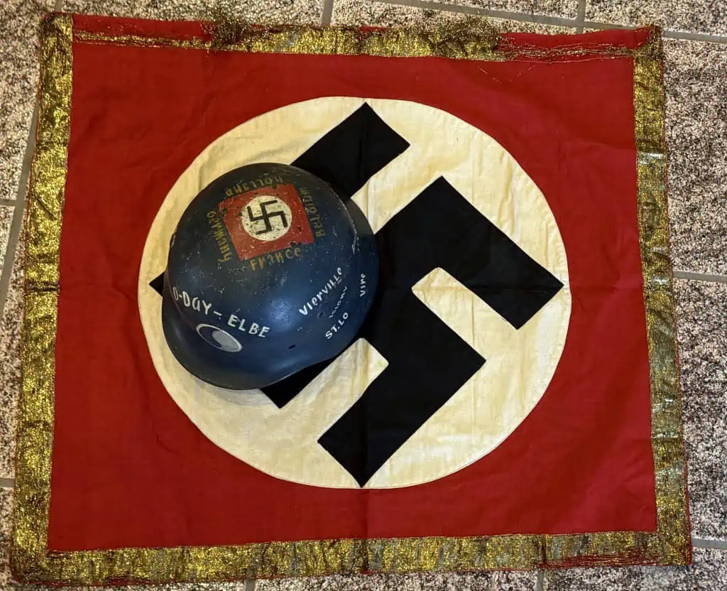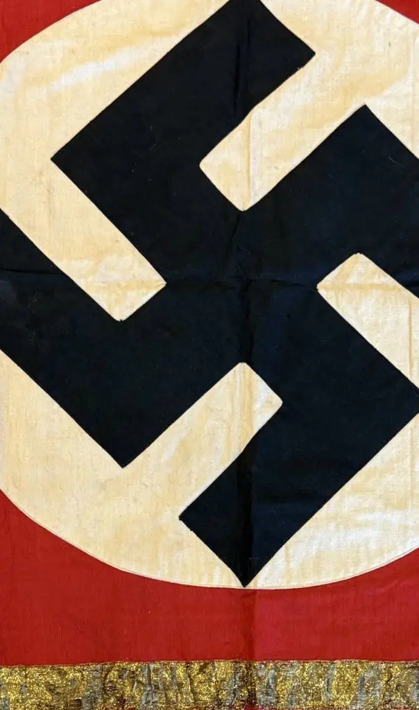 Original WWII Era German Nazi Party GOLD Podium Flag Certified. A High Quality style Cloth banner (Podium Style) type flag. Utilized by pretty much by all the organization of the Third Reich in one form or another. The swastika, (a Sanskrit word meaning “well being”), is an ancient symbol that was utilized in numerous diverse cultures and signified both the cycle of life and the sun. The swastika was also a Nordic rune and the pagan Germanic symbol for Thor, God of Adventurers. In good condition single sided 29″/44″!!! standard cotton bunting style material with separate sewn white disk and screened swastika. It has a GOLD fancy stripe around the edge. We placed a helmet on the flag for size reference. THIS TYPE WAS USED AS WINDOW DRESSING AT HOTELS WHEN HITLER OR OTHER HIGH LEADERS WOULD BE THERE (SEE PHOTOS) A fantastic piece of WWII history . (see photos) good condition with Very minor storage wear and one spot of loss at the bottom (see photos) . This flag is A very good quality version and one of the better sizes for the most discriminating and cultivated collector. it Overall a very collectible flag with lots of history Nice period used flag captured by a U.S. Veteran and brought home as a war trophy. Nice used example showing the expected age 100% Guaranteed to be authentic Brought home by a solider as a trophy of war. A very desirable size in good condition an outstanding example. Don’t miss this one! RARE in this size. Complete museum documentation (COA) Provided. Certified by The Gettysburg Museum of History. The Gettysburg Museum of History does not support or condone Adolf Hitler or the Nazi Party and is only offering this as a historic relic. Please see our other items. Also note when browsing our web site there are several pages of items, at the bottom of the list look for other page numbers. This is the type as seen in the photo with Hitler at the big rallies. RARE IN THIS SIZE. OUTSTANDING EXAMPLE! NSDAP FLAGS ARE GETTING TOUGHER TO FIND! RARE IN GOLD BULLION Some loss to the gold see photos Don’t Miss It!!!