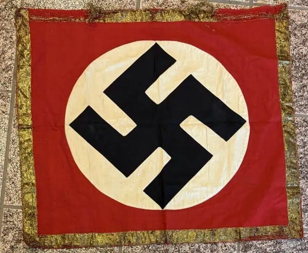 Original WWII Era German Nazi Party GOLD Podium Flag Certified. A High Quality style Cloth banner (Podium Style) type flag. Utilized by pretty much by all the organization of the Third Reich in one form or another. The swastika, (a Sanskrit word meaning “well being”), is an ancient symbol that was utilized in numerous diverse cultures and signified both the cycle of life and the sun. The swastika was also a Nordic rune and the pagan Germanic symbol for Thor, God of Adventurers. In good condition single sided 29″/44″!!! standard cotton bunting style material with separate sewn white disk and screened swastika. It has a GOLD fancy stripe around the edge. We placed a helmet on the flag for size reference. THIS TYPE WAS USED AS WINDOW DRESSING AT HOTELS WHEN HITLER OR OTHER HIGH LEADERS WOULD BE THERE (SEE PHOTOS) A fantastic piece of WWII history . (see photos) good condition with Very minor storage wear and one spot of loss at the bottom (see photos) . This flag is A very good quality version and one of the better sizes for the most discriminating and cultivated collector. it Overall a very collectible flag with lots of history Nice period used flag captured by a U.S. Veteran and brought home as a war trophy. Nice used example showing the expected age 100% Guaranteed to be authentic Brought home by a solider as a trophy of war. A very desirable size in good condition an outstanding example. Don’t miss this one! RARE in this size. Complete museum documentation (COA) Provided. Certified by The Gettysburg Museum of History. The Gettysburg Museum of History does not support or condone Adolf Hitler or the Nazi Party and is only offering this as a historic relic. Please see our other items. Also note when browsing our web site there are several pages of items, at the bottom of the list look for other page numbers. This is the type as seen in the photo with Hitler at the big rallies. RARE IN THIS SIZE. OUTSTANDING EXAMPLE! NSDAP FLAGS ARE GETTING TOUGHER TO FIND! RARE IN GOLD BULLION Some loss to the gold see photos Don’t Miss It!!!