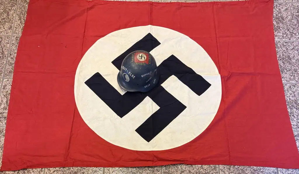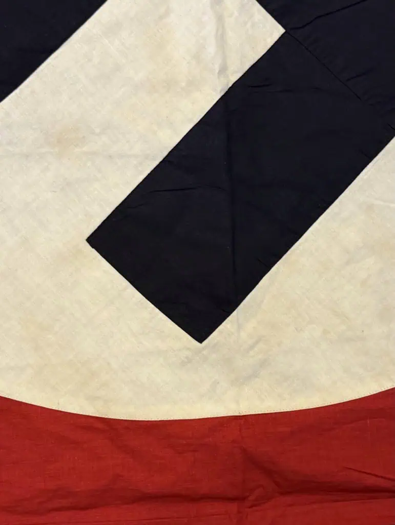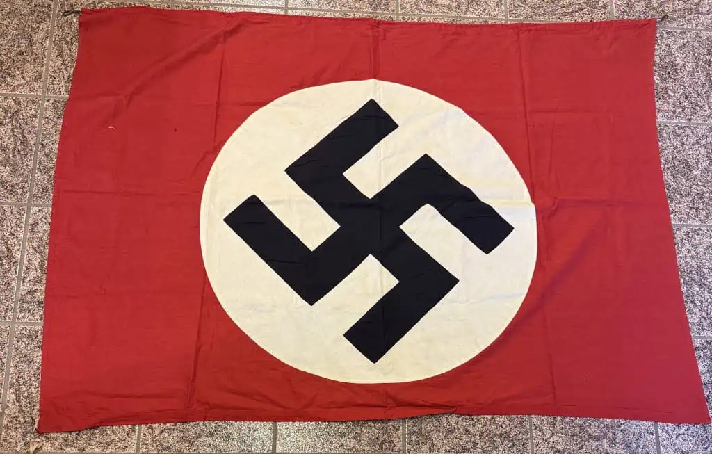 LARGE Original WWII Era German Nazi Party Flag Certified. A standard style large Cloth banner type flag. Utilized by pretty much by all the organization of the Third Reich in one form or another. The swastika, (a Sanskrit word meaning “well-being”), is an ancient symbol that was utilized in numerous diverse cultures and signified both the cycle of life and the sun. The swastika was also a Nordic rune and the pagan Germanic symbol for Thor, God of Adventurers.  In good condition single sided large 45″/61″!!!  (Great Size) standard cotton blend bunting style material with separate sewn white disk and high qualify multi piece swastika. We placed a helmet on the flag for size reference.   A fantastic piece of WWII history. Has original cloth edge with original RARE METAL HOOKS   for attaching to a pole or building. (see photos) It has 2 hooks. THIS STYLE IS A RARE LANDSCAPE VERSION FOR HANGING ACROSS A BUILDING LONG-WISE! good condition with Very minor storage wear (a few minor storage spots that are barely noticeable, no fading (see photos) Excellent condition (SEE PHOTOS) This is one of the nicer FLAGS WE HAVE HAD (it looks almost mint)! This flag is a VERY HIGH-quality version and one of the better larger sizes for the most discriminating and cultivated collector. Even with the one minor condition issues it is overall a very collectible flag with lots of history. Nice period used flag captured by a U.S. Veteran and brought home as a war trophy. Nice used example showing the expected age and wear. 100% Guaranteed to be authentic Brought home by a solider as a trophy of war. A very desirable size in good condition an outstanding example. Don’t miss this one!  RARE in this size. Complete museum documentation (COA) Provided. Certified by The Gettysburg Museum of History. The Gettysburg Museum of History does not support or condone Adolf Hitler or the Nazi Party and is only offering this as a historic relic. Please see our other items.  Also note when browsing our web site there are several pages of items, at the bottom of the list look for other page numbers. This is the type as seen in the photo with Hitler at the big rallies. RARE IN THIS SIZE. OUTSTANDING EXAMPLE NSDAP FLAGS ARE GETTING TOUGHER TO FIND!   Don’t Miss It!!!! RARE, Excellent  Condition!