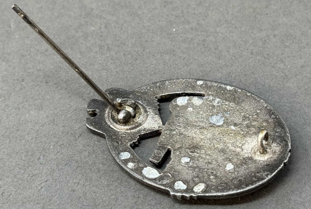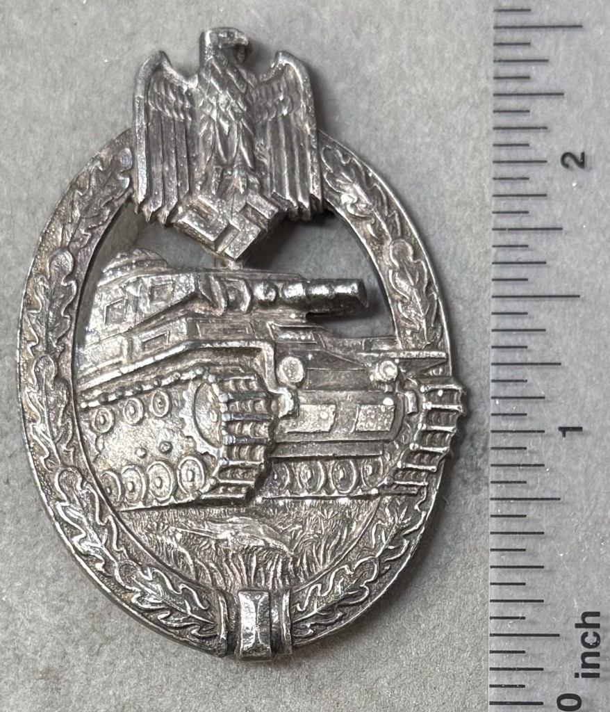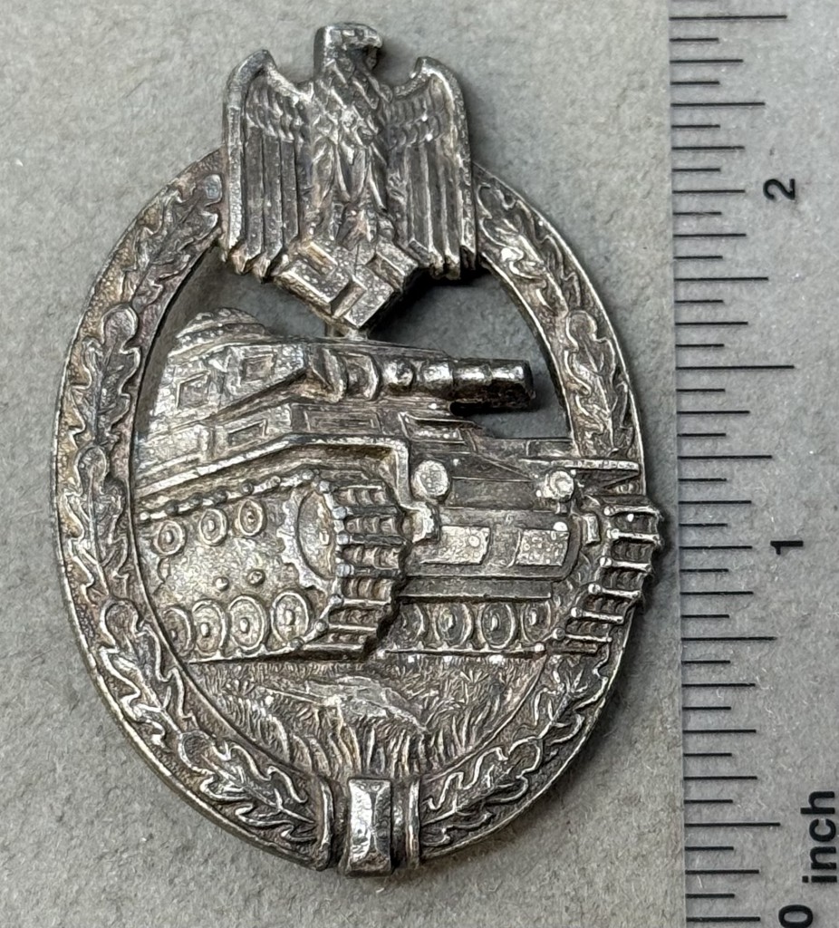 Original WWII German Army (Heer) SS PANZER ASSAULT BADGE, SILVER. (Panzerkampfabzeichen in Silber) Certified. The Panzer Assault Badge in silver was instituted by Generaloberst Walther von Brauchitsch on December 20TH 1939 for award to all ranks of tank personnel in the Army or SS who served as a tank commander, driver, gunner or radio operator and had been involved in three different armored assaults on three different days. The institution order indicated the criteria for award of the badge was to be effective as of January 1ST 1940. Of Note: On June 1ST 1940 a Bronze version of the Panzer Assault Badge was introduced for award to Panzer-Grenadier, medical, and armored car personnel who participated in three different armored assaults on three different days. Die struck alloy construction, badge with a silver washed finish features a vertically oval oak-leaf wreath with a Wehrmacht style eagle with down-swept wings, superimposed to the top center, encompassing the forward profile of a tank. The plane reverse has a crimped, soldered hinge, a thin round vertical pin is intact the catch is attached and functions properly. Nicely maker marked! In good used condition! With some typical casting patina on the back not effecting the front. Brought home by a. Veteran as a trophy of war.100% Guaranteed to be authentic. Complete museum documentation (COA) Provided. Please see our other German Medals and Relics From WWII. Also note when browsing our web site there are several pages of items, at the bottom of the list look for other page numbers. OUTSTANDING BADGE Don’t miss it! Some of the silver wash is still intact, it looks great! Don’t Miss This One!