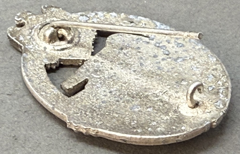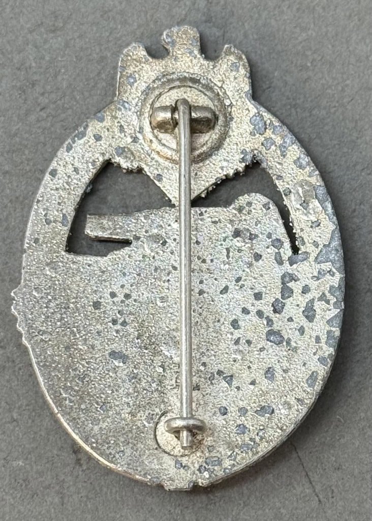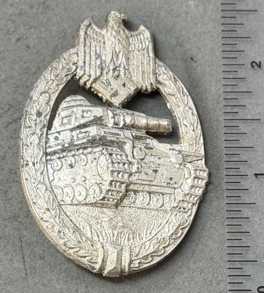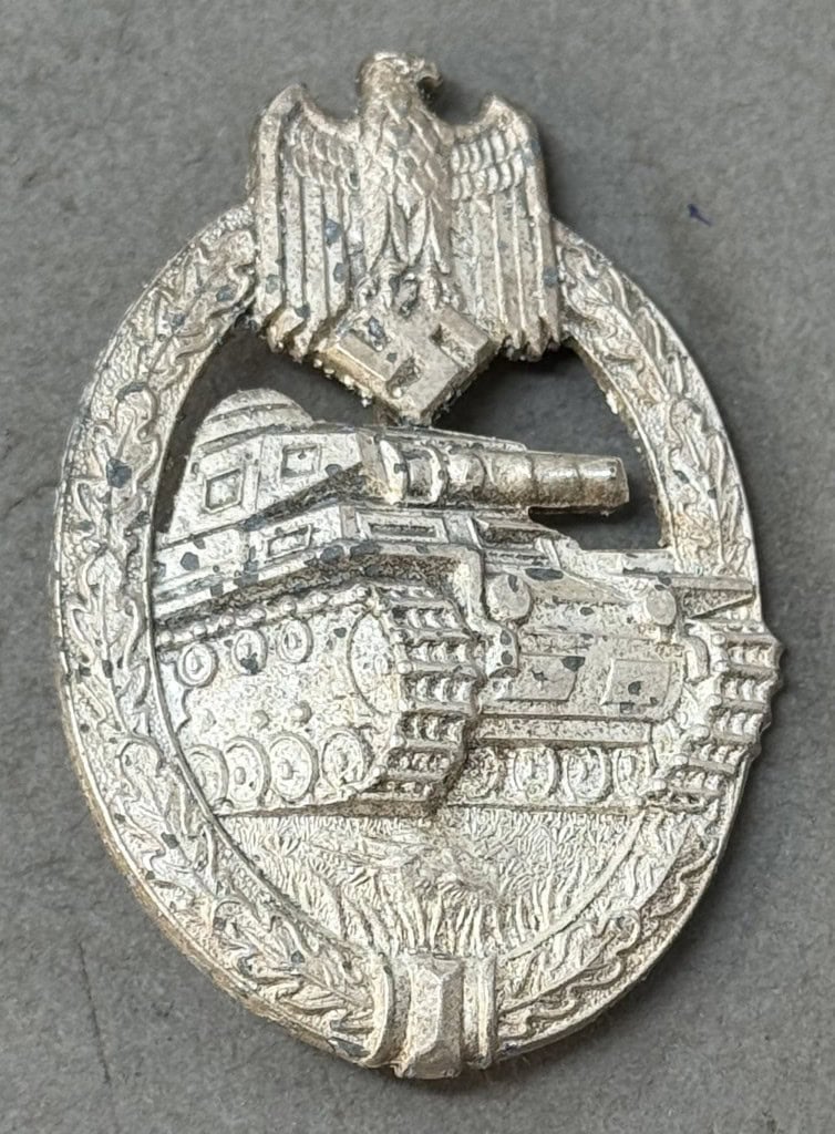 Original WWII German Army (Heer) SS PANZER ASSAULT BADGE, SILVER. (Panzerkampfabzeichen in Silber) Certified. The Panzer Assault Badge in silver was instituted by Generaloberst Walther von Brauchitsch on December 20TH 1939 for award to all ranks of tank personnel in the Army or SS who served as a tank commander, driver, gunner or radio operator and had been involved in three different armored assaults on three different days. The institution order indicated the criteria for award of the badge was to be effective as of January 1ST 1940. Of Note: On June 1ST 1940 a Bronze version of the Panzer Assault Badge was introduced for award to Panzer-Grenadier, medical, and armored car personnel who participated in three different armored assaults on three different days. Die struck alloy construction, badge with a silver washed finish features a vertically oval oak-leaf wreath with a Wehrmacht style eagle with down-swept wings, superimposed to the top center, encompassing the forward profile of a tank. The plane  reverse has a crimped, soldered hinge, a thin round vertical pin is intact the catch is attached and functions properly. Nicely maker marked! In good used condition! With some typical casting patina on the back not effecting the front.   Brought home by a. Veteran as a trophy of war.100% Guaranteed to be authentic. Complete museum documentation (COA) Provided. Please see our other German Medals and Relics From WWII. Also note when browsing our web site there are several pages of items, at the bottom of the list look for other page numbers. OUTSTANDING BADGE Don’t miss it! Some of the silver wash is still intact, it looks great! Don’t Miss This One!