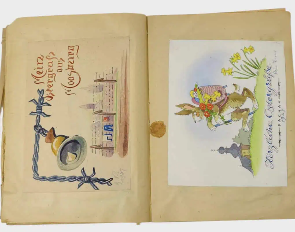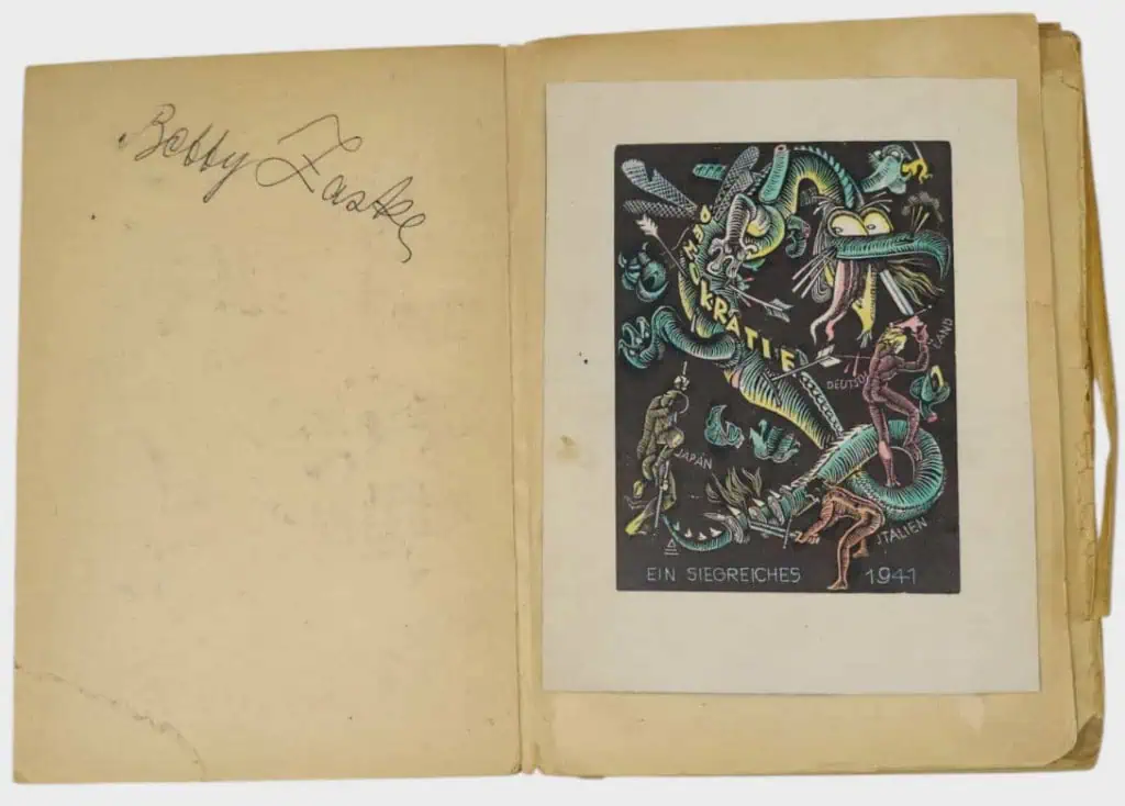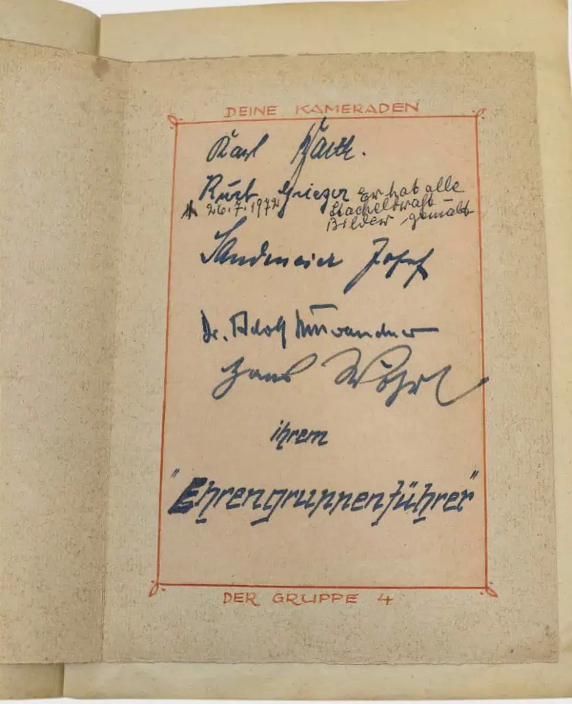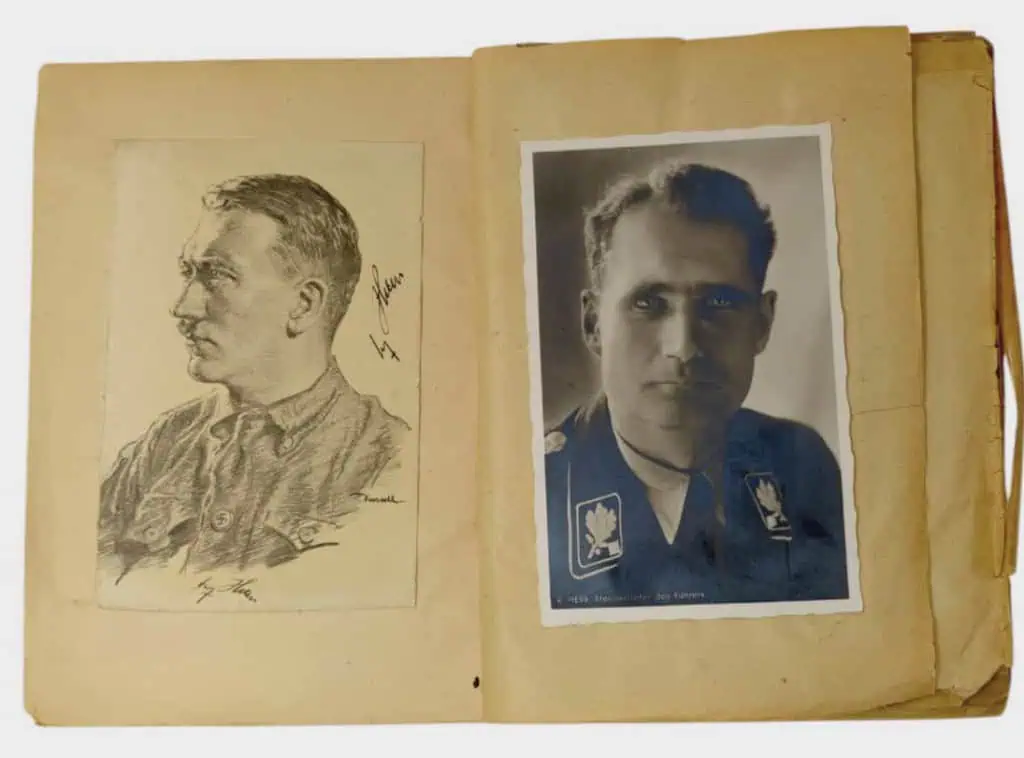 OUTSTANDING ORIGINAL ADOLF HITLER Hand Signed AUTOGRAPH With Historic SS Archive Certified. A singular and historically explosive personal scrapbook compiled by Betty Zaske, wife of SS-Hauptsturmführer Ernst Zaske, which provides a continuous and deeply revealing narrative from the zenith of the Third Reich through the immediate post-war imprisonment of its most devoted followers. This artifact’s importance transcends typical memorabilia, offering an unfiltered view into the world of the Nazi elite, both in power and in defeat. The collection’s unparalleled value is cemented by a remarkable and extensive collection of original, handmade artwork, correspondence, and defiant, unrepentant political statements sent by Ernst Zaske and his SS “comrades” from the Allied internment camps at Dachau and Moosburg between 1946 and 1948. This is a cohesive archive documenting the public ideology and private reality of a family at the absolute center of the Nazi regime and the persistence of that ideology after its total collapse. Extraordinary Provenance: From Himmler’s Staff to Hitler’s Retreat. The scrapbook originates from the very heart of the SS power structure. Betty Zaske’s husband, SS-Hauptsturmführer Ernst Zaske, was an Alter Kämpfer (“Old Fighter”) with the low SS number 1338 and a recipient of the NSDAP Golden Party Badge. He served on the Persönlicher Stab Reichsführer-SS-Heinrich Himmler’s personal staff-the administrative and ideological core of the entire SS empire. The family’s elite status is confirmed by mementos from Obersalzberg in 1934 and a 1935 invitation from Deputy Führer Rudolf Hess to the topping-out ceremony for his home in Garlaching. The invitation bears Hess’s name inscribed in ink in the upper corner, possibly by the scrapbook’s compiler to note its origin. Highlights of the Collection: An Authentic, Live-Signed Postcard of Adolf Hitler: The album’s centerpiece is a commercially produced postcard of the era, featuring a portrait of Adolf Hitler by the artist Otto von Kursell, a prominent Nazi party member and director at the Berlin University of the Arts. The postcard bears a strong, clear, and verified live ink signature of Adolf Hitler along its right edge. Unprecedented Post-War Internment Camp Archive (1946-1948): The scrapbook contains a stunning collection of handmade items sent from Allied internment camps, documenting the imprisonment of Ernst Zaske and his fellow SS officers. This section includes: Artwork from Dachau and Moosburg: A series of beautifully hand-painted and calligraphed cards sent by Ernst Zaske to his wife, including a New Year’s card for 1948, a birthday card from Moosburg (Jan. 1947), and a remarkable Easter card dated “DACHAU 1948”. The artwork is both poignant and defiant, featuring symbolic imagery such as roses growing on barbed wire and a bell hanging from a barbed-wire fence over a depiction of the Moosburg camp. An Unrepentant Nazi Manifesto: Tipped into the album is a handwritten note from Zaske’s imprisoned “comrades.” It is a stunningly defiant statement of unrepentant Nazism, declaring: “und trotzdem muß u. wird Wahrheit Wahrheit bleiben. Wir waren keine Verbrecher – Adolf Hitler wollte für sein Volk nur das beste…” (“…and nevertheless, truth must and will remain truth. We were not criminals – Adolf Hitler only wanted the best for his people…”). This is a raw, unfiltered articulation of the steadfast Nazi worldview held by these men even after the full revelation of the regime’s atrocities. SS Comradeship in Defeat: The manifesto is accompanied by a tribute page signed by several fellow prisoners, including Paul Wirth and Dr. Adolf Schwander. They address the tribute to Zaske as their “Ehrengruppenführer” (“Honorary Group Leader”) of “Group 4,” proving that the SS command structure and sense of camaraderie persisted within the internment camps and that Zaske held a position of leadership and respect among his peers. The Post-War Network (1949): The narrative of the unrepentant Nazi network is powerfully concluded with a handwritten entry from Gertrud Scholz-Klink, the former Reichsfrauenführerin (Reich Women’s Leader). Dated Tübingen, March 1949, after her own trial and conviction, this entry provides undeniable proof of a clandestine social network of high-level Nazis operating within postwar Germany. A Curated Ideological World: The pre-1945 portion of the album is a masterclass in Nazi cultural curation. Adolf Hitler 1927 Signature in Third Reich SS Inner Circle Scrapbook of Betty Zaske, with Rudolf Hess Invitation, and Unprecedented Dachau & Moosburg Internment Camp Artwork & Unrepentant Nazi Writings from 1946-1948.. . In good condition. Complete museum documentation (COA) Provided. Certified by The Gettysburg Museum of History. 100% guaranteed to be authentic. The Gettysburg Museum of History does not support or condone Adolf Hitler or the Nazi Party and is only offering this as a historic relic. Please see our other items. Also note when browsing our web site there are several pages of items, at the bottom of the list look for other page numbers. Authentic Hitler Autographs are RARE and Very Desirable To Collectors And Historians! A VERY BOLD DARK CLEAR SIGNATURE! DO NOT MISS THIS! The Brown House Stamp Makes This A Very Interesting and Historic Archive And Autograph!