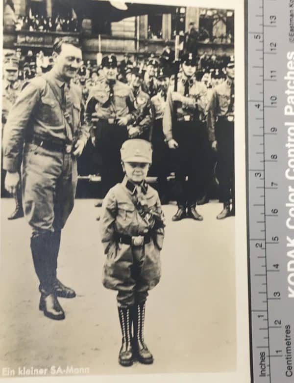 Outstanding Early Adolf Hitler Photo Circa 1934 By Hoffman Certified By The Gettysburg Museum Of History. Hitler had Hoffman, his photographer take a series of photos just after becoming the Chancellor of Germany in 1930’s. This is one of the choice early Hitler images and is one of the more desirable images. Hitler with a young fan dressed as an early SA Man/Brownshirt. Printed on real photo paper (this is an actual photograph) off the original Hoffman negative in 1934-35. Nice used example with the expected age with some storage wear. 100% Guaranteed to be authentic. Original period images of Hitler are rare, most were destroyed at the end of WWII. A very collectible size in excellent condition some slight creasing . Heinrich Hoffman was Hitler’s personal photographer and his photos are very collectible and desirable. Has Hoffman’s name and photographer’s stamp on the back. Complete museum documentation (COA) Provided. Certified by The Gettysburg Museum of History. The Gettysburg Museum of History does not support or condone Adolf Hitler or the Nazi Party and is only offering this as a historic relic. Please see our other items. Also note when browsing our web site there are several pages of items, at the bottom of the list look for other page numbers. EXCELLENT EXAMPLE! Perfect contrast right off Hoffman’s negative! Don’t Miss It! VERY RARE!