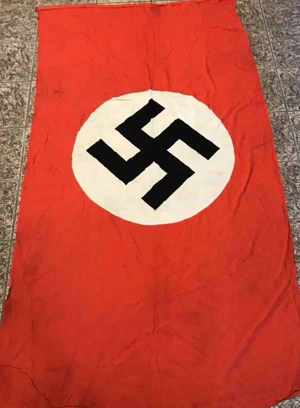 LARGE Original WWII Era German Nazi Party Flag Certified. A standard style large Cloth banner type flag. Utilized by pretty much by all the organization of the Third Reich in one form or another. The swastika, (a Sanskrit word meaning “well-being”), is an ancient symbol that was utilized in numerous diverse cultures and signified both the cycle of life and the sun. The swastika was also a Nordic rune and the pagan Germanic symbol for Thor, God of Adventurers. In good condition DOUBLE sided large 43″/69″!!! standard cotton bunting style material with separate sewn white disk and a s screened Swastika. We placed a helmet on the flag for size reference. A fantastic piece of WWII history. Has the original cloth loop for attaching to a pole. In good condition with minor storage wear (see photos) A few small spots and minor pin holes good condition, great but used! GOOD BUT USED CONDITION. This flag is a good quality version and one of the better sizes for the most discriminating and cultivated collector. Even with the minor condition issues it is overall a very collectible flag with lots of history. Nice period used flag captured by a U.S. Veteran and brought home as a war trophy. Nice used example showing the expected age and wear. 100% Guaranteed to be authentic Brought home by a solider as a trophy of war. A very desirable size in good condition an outstanding example. Don’t miss this one! RARE in this size. Complete museum documentation (COA) Provided. Certified by The Gettysburg Museum of History. The Gettysburg Museum of History does not support or condone Adolf Hitler or the Nazi Party and is only offering this as a historic relic. Please see our other items. Also note when browsing our web site there are several pages of items, at the bottom of the list look for other page numbers. RARE IN THIS SIZE. OUTSTANDING EXAMPLE! NSDAP FLAGS ARE GETTING TOUGHER TO FIND! Don’t Miss It!!!! RARE, GOOD BUT USED Condition!