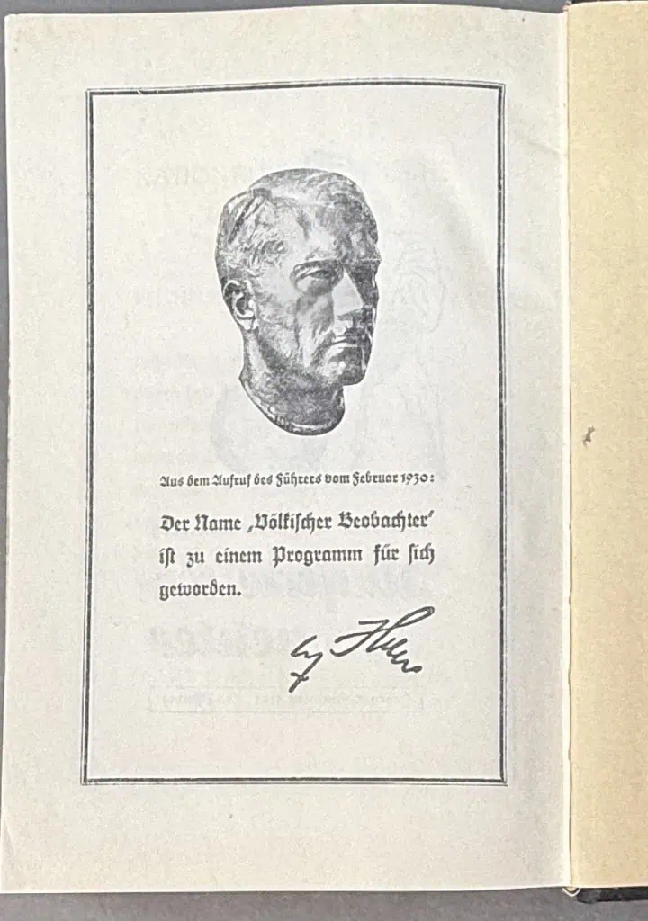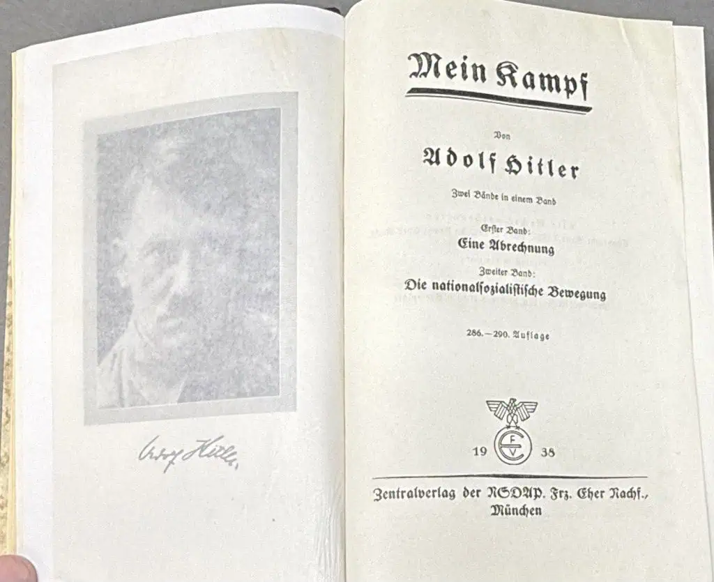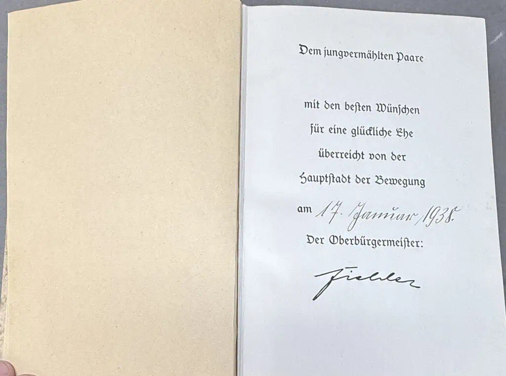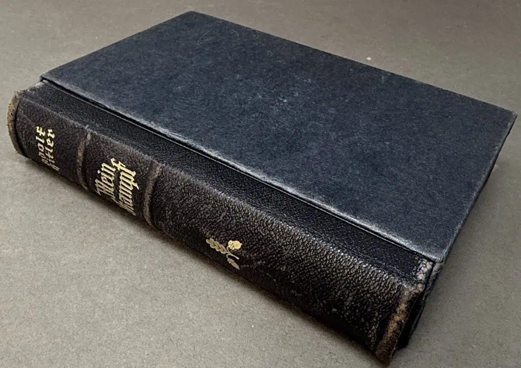 Original RARE GERMAN RARE 1938 Munich WEDDING EDITION OF ADOLF HITLERS “MEIN KAMPF” With Slip Cover Certified. Adolf Hitler’s autobiography and political manifest. The copy that is offered for sale was published in 1938 by Central Publishing House of the NSDAP, Franz Eher, Nachf. in Munich, Germany. In 1935, the Eher publishing house presented Hitler with the idea of giving a specially printed edition of Mein Kampf to every newlywed couple on the day of their wedding. This edition was published with a leather spine and would contain an extra presentation page in the front with blanks for the names of bride and groom and the signature of the mayor of the city, town or village! The book is in very nice condition. The binding is tight, and all pages are intact. (see photos) The standard editions of Mein Kampf were published in the same size as a standard German bible. The reason for that was that Hitler hoped that his book would eventually replace the bible in German households! Hitler dictated this book to his secretary, Rudolf Hess while imprisoned in Landsberg after the failed 1923 revolution. The first editions, published in 1925 (Band I or Volume One) and 1926 (Band II or Volume Two) were published in separate volumes. With only a few exceptions (special editions) all subsequent Third Reich editions (1933 to 1945) contained both volumes combined in one book. Very few copies of the first editions have survived. When his book first came out it was not a success, few people cared about the book in 1925 which would almost have had a much longer title. The original title Hitler chose was “Viereinhalb Jahre [des Kampfes] gegen Lüge, Dummheit und Feigheit” (Four and a Half Years [of Struggle] against Lies, Stupidity and Cowardice). His Nazi publisher, Max Amann, decided this title was too complicated and had it shortened to Mein Kampf (simply “My Struggle”). Before Hitler became Reichs Chancellor of Germany in 1933, Mein Kampf sold very slowly; but in 1933 alone 1.5 million copies were sold. Some storage wear and typical age wear. 100% guaranteed to be authentic complete museum documentation (COA) provided. An amazing historical artifact from the 20th century’s most infamous person.  See our other AH pieces too. Also note when browsing our web site there are several pages of items, at the bottom of the list look for other page numbers! DO NOT MISS THIS! Rare Munich edition with slip cover and inscription from the Burgermiester