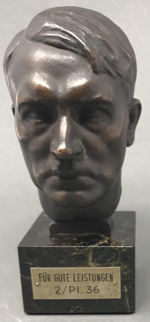 Original Desk Top Adolf Hitler Bust With Heavy Marble Base Certified. Adolf Hitler Bust SOLID BRONZE . Everything is original. It’s on a marble base with the felt still attached to the bottom. It stands about 8 inches tall in total. VERY HEAVY! Has a presentation plaque. Super high quality likeness of Hitler. A very nice looking artifact. very fine. In very good condition. Nice used example showing the expected but mild storage age and wear . 100% Guaranteed to be authentic. Complete museum documentation (COA) Provided. Certified by The Gettysburg Museum of History. The Gettysburg Museum of History does not support or condone Adolf Hitler or the Nazi Party and is only offering this as a historic relic. Please see our other items. Also note when browsing our web site there are several pages of items, at the bottom of the list look for other page numbers. Nice Example! Don’t Miss It!