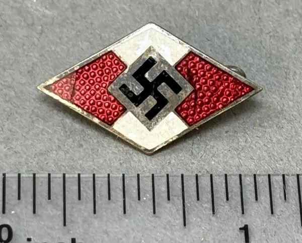 Original Third Reich German Hitler Youth Membership Badge Certified. Roughly 25mm tall, 14mm wide, die struck alloy, diamond shaped badge with red, white and black enamel work. The vertical diamond badge features translucent red enamel with an underlying pebbled field to the top and bottom quarters and solid white enamel to the side quarters. The center of the badge has a diamond with a central canted black enamel swastika. Pin back device on reverse . RZM marked Nice example issued with expected storage wear (see photos). Gettysburg Museum Certified (COA) provided. Rare 100% Guaranteed to be authentic. Sold for historic purposes only. See our other pieces on our web site. Also note when browsing our web site there are several pages of items, at the bottom of the list look for other page numbers. VERY NICE EARLY Used EXAMPLE