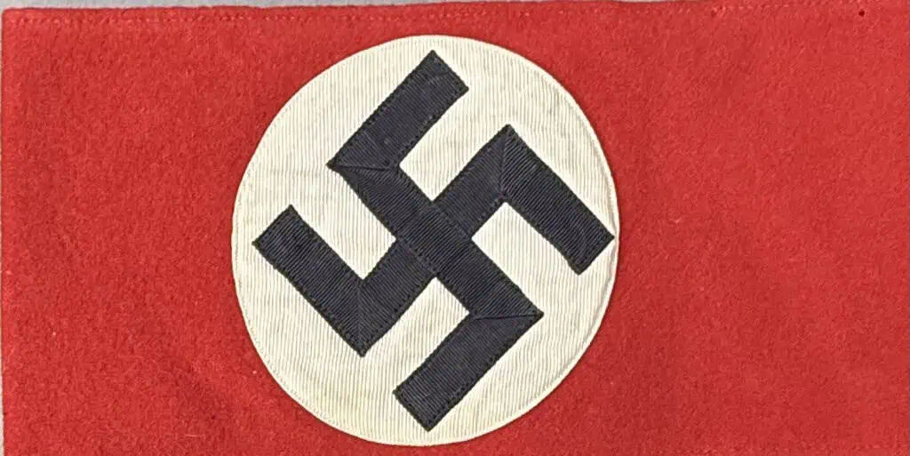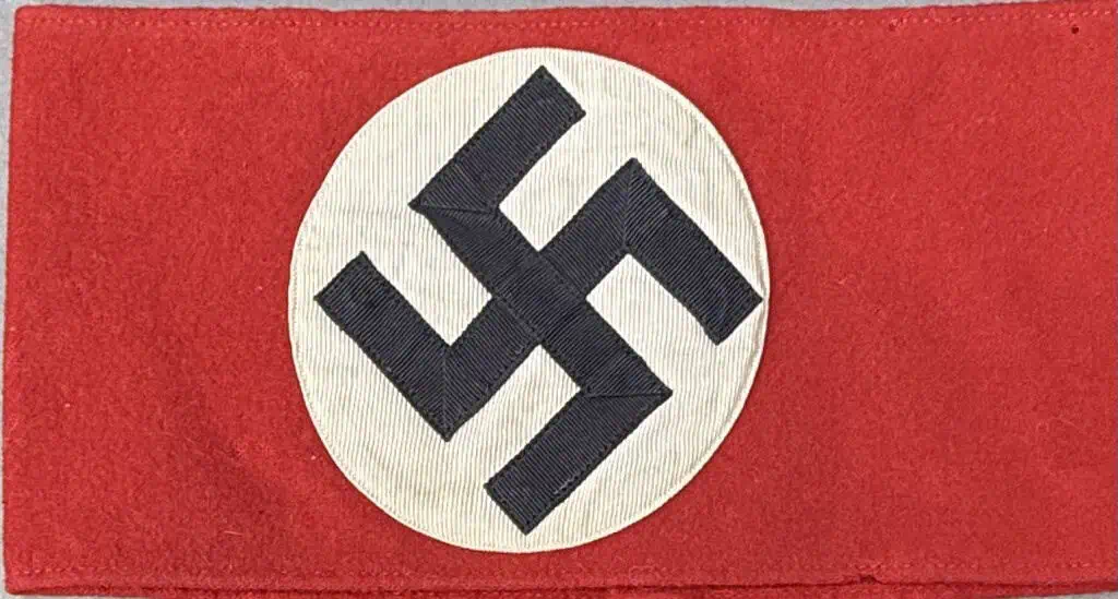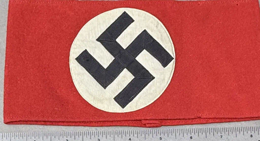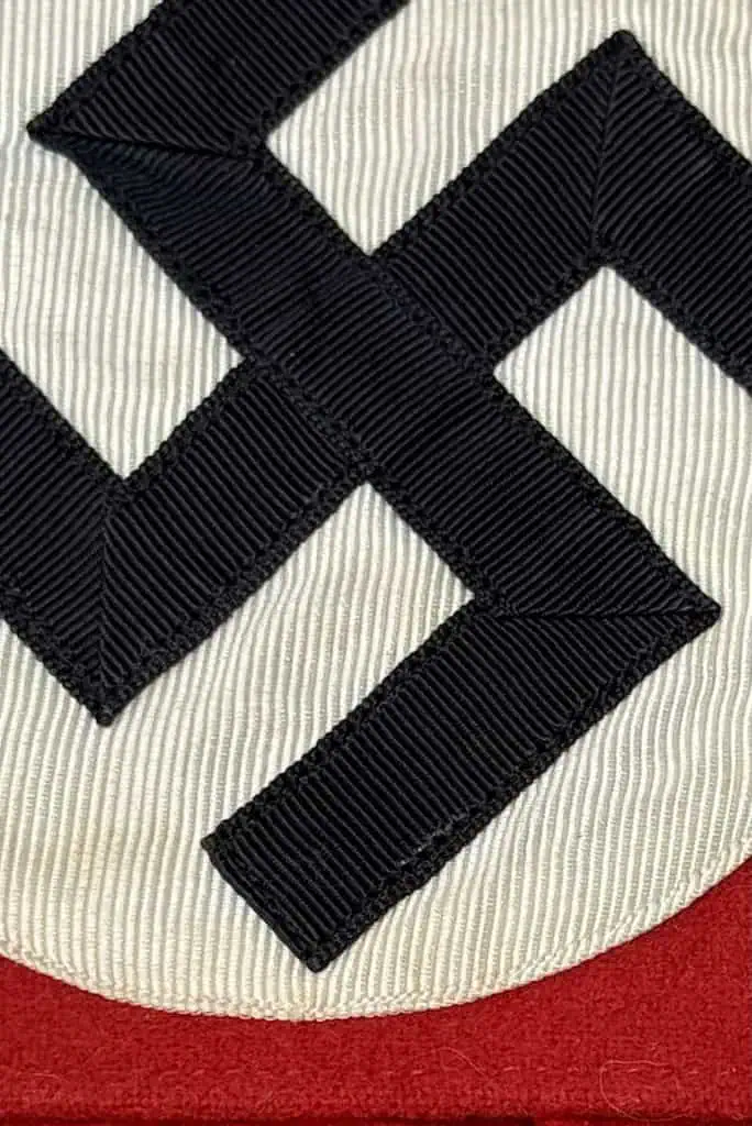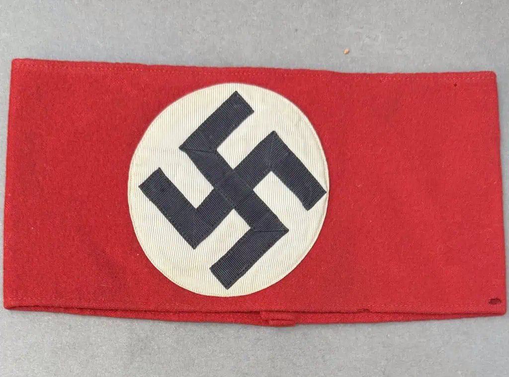 Original WWII Deluxe Nazi German Multi-Piece Construction Armband. In good Condition! Deluxe version of the Nazi Arm Band. The most recognizable pieces of insignia associated with the Nazi regime is the swastika armband. Utilized by pretty much by all the organization of the Third Reich in one form or another. The swastika, (a Sanskrit word meaning “well-being”), is an ancient symbol that was utilized in numerous diverse cultures and signified both the cycle of life and the sun. The swastika was also a Nordic rune and the pagan Germanic symbol for Thor, God of Adventurers. A high-quality wool cloth materiel, approximately 9cm diameter, rayon blend white disk, and high-quality multi-piece swastika. VERY high-quality example. A very good earlier example. Some chaffing from wear and storage (see photos) Gettysburg Museum Certified (COA) provided. Rare 100% Guaranteed to be authentic. Sold for historic purposes only. See our other pieces on our web site. Also note when browsing our web site there are several pages of items, at the bottom of the list look for other page numbers. Do not miss this one! Nice EXAMPLE with some chaffing One small moth nip otherwise Nice used example