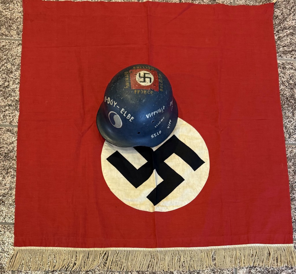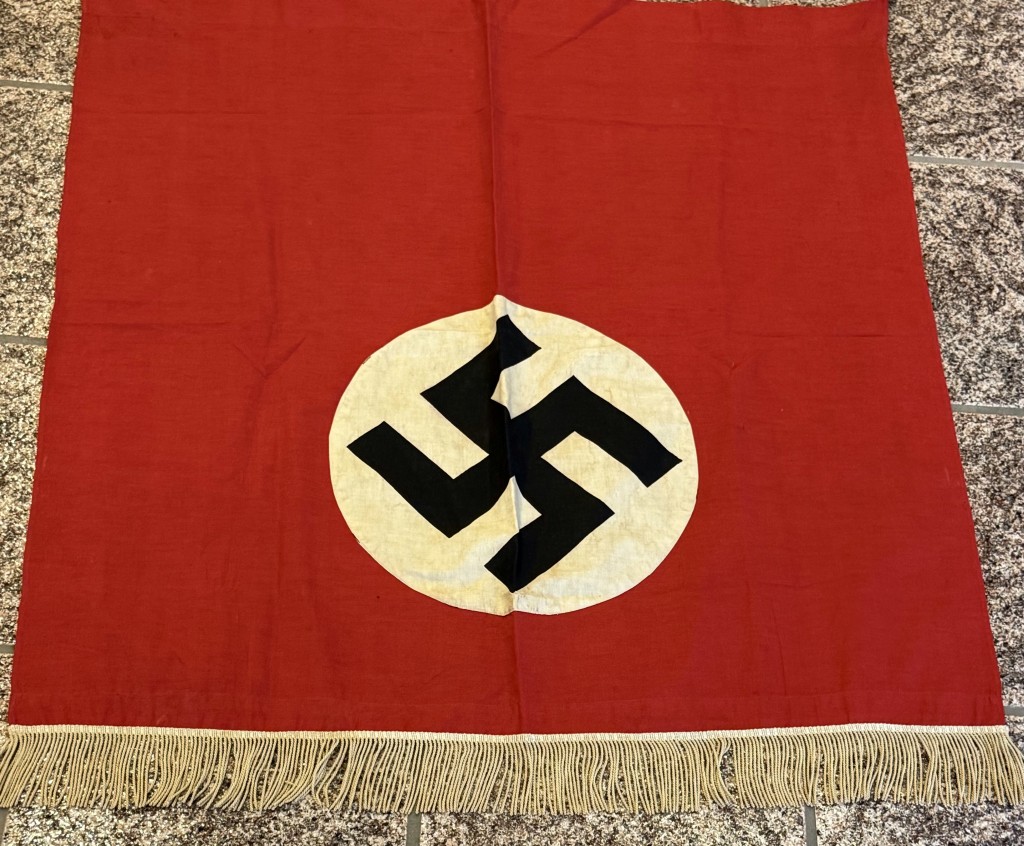Original WWII Era German Nazi Party Podium Flag Certified. A standard style Cloth banner (Podium Style) type flag. Utilized by pretty much by all the organization of the Third Reich in one form or another. The swastika, (a Sanskrit word meaning “well-being”), is an ancient symbol that was utilized in numerous diverse cultures and signified both the cycle of life and the sun. The swastika was also a Nordic rune and the pagan Germanic symbol for Thor, God of Adventurers.   In good condition single sided 31″/33″!!! standard cotton bunting style material with separate sewn white disk and screened swastika. It has high quality white fringe material at the bottom. We placed a helmet on the flag for size reference.   A fantastic piece of WWII history. (see photos) good condition  with very minor storage wear no fading (see photos) . This flag is A good quality version and one of the better sizes for the most   discriminating and cultivated collector.  it   Overall a very collectible flag with lots of history. Nice period used flag captured by a U.S. Veteran  and brought home as a war trophy. Nice used example showing the expected age 100% Guaranteed to be authentic Brought home by a solider as a trophy of war. A very desirable size   in good condition an outstanding   example. Don’t miss this one! Has a small barley noticeable tear.    RARE in this size. Complete museum documentation (COA) Provided. Certified by The Gettysburg Museum of History. The Gettysburg Museum of History does not support or condone Adolf Hitler or the Nazi Party and is only offering this as a historic relic. Please see our other items.  Also note when browsing our web site there are several pages of items, at the bottom of the list look for other page numbers.  RARE IN THIS SIZE. OUTSTANDING EXAMPLE! NSDAP FLAGS ARE GETTING TOUGHER TO FIND!   Don’t Miss It!!!! RARE, CLEAN, example. Nice displayable size!