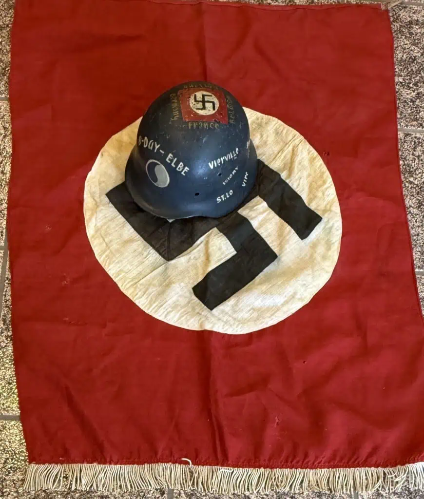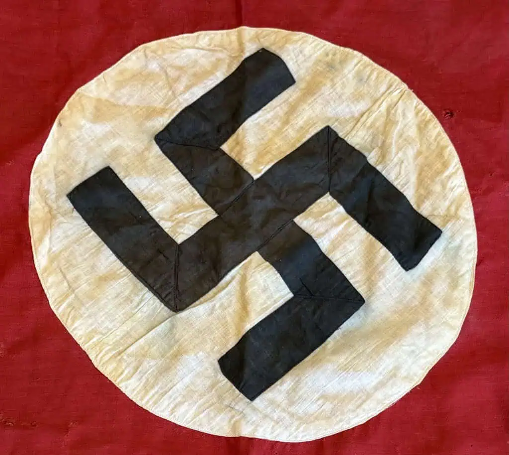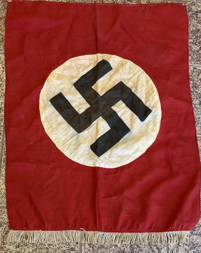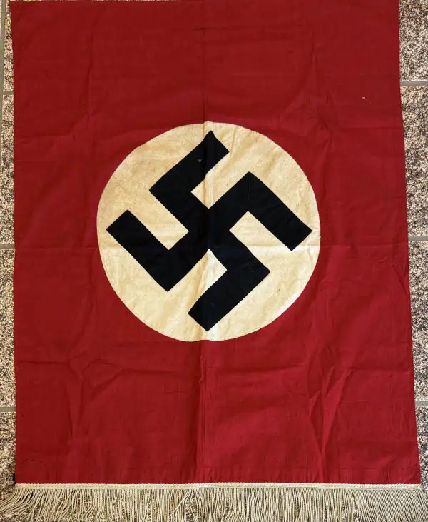 Original WWII Era German Nazi Party Podium Flag Certified. A standard style Cloth banner (Podium Style) type flag. Utilized by pretty much by all the organization of the Third Reich in one form or another. The swastika, (a Sanskrit word meaning “well-being”), is an ancient symbol that was utilized in numerous diverse cultures and signified both the cycle of life and the sun. The swastika was also a Nordic rune and the pagan Germanic symbol for Thor, God of Adventurers. In good condition single sided 28″/37″!!! standard cotton bunting style material with separate sewn white disk and hi quality multi-piece swastika. It has high quality white fringe material at the bottom. We placed a helmet on the flag for size reference. A fantastic piece of WWII history. (see photos) good condition with very minor storage wear (see photos) . This flag is A good quality version and one of the better sizes for the most discriminating and cultivated collector. it Overall a very collectible flag with lots of history. Nice period used flag showing the expected age 100% Guaranteed to be authentic A very desirable size in good condition an outstanding example. Don’t miss this one! Has a few small Nips. Complete museum documentation (COA) Provided. Certified by The Gettysburg Museum of History. The Gettysburg Museum of History does not support or condone Adolf Hitler or the Nazi Party and is only offering this as a historic relic. Please see our other items. Also note when browsing our web site there are several pages of items, at the bottom of the list look for other page numbers. RARE IN THIS SIZE. OUTSTANDING EXAMPLE! NSDAP FLAGS ARE GETTING TOUGHER TO FIND! Don’t Miss It!!!! RARE, CLEAN, example. (see photos) Nice displayable size!