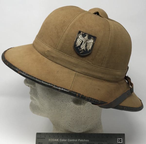 Original WWII German Army (HEER) FIRST PATTERN TROPICAL PITH HELMET. (Tropenhelm) Certified. In late 1940, with the impending German entrance into the North African campaign, tropical uniforms, headgear and equipment were quickly developed and issued in time for DAK, Deutsches Afrika Korps, (German Africa Corps), personnel’s arrival in Tripoli in February 1941. One of the new headgear items introduced was the tropical pith helmet which was based on the design of the earlier Kriegsmarine pith helmet. On its introduction the pith helmet was constructed of a formed cork base with a cotton twill covering until a second pattern pith helmet was introduced with a formed cork base with a felt covering. The second pattern pith helmet followed the same basic design as the first pattern but was modified to ease production time and material costs. Wear of the pith helmets was extended to personnel serving in southern areas of continental Europe but the helmets proved ineffective and unpopular and manufacture was discontinued sometime in 1942. On introduction the tropical pith helmets were outfitted with a national eagle and national tri-color identification shields. First pattern tropical pith helmet, with a formed, cork core covered in a ribbed, tan cotton twill. The helmet features a six panel, vertically seamed, tan cotton twill crown with a horizontal band stitched at the rear center at the juncture of the crown and the all around visor. The helmet has two stamped alloy shields with a national eagle to the left side and a national tri-color shield to the right side. The national eagle shield features a high relief, embossed, Wehrmacht style eagle with down-swept wings, on a slightly textured, black painted, background field. The national tri-color shield features three diagonally angled bars in the colors of red, white, and black on a slightly textured background field. Sweatband is complete. Chinstrap is complete . Some  wear on the  Edge trim. some fading from use. Size is  marked 54. . Nice example showing the expected minor age and wear overall good condition.   One of the classic desirable collector’s items   from the Third Reich  in good condition.   Gettysburg Museum Certified (COA) provided.   100% Guaranteed to be authentic. Sold for historic purposes only. See our other pieces on our web site.    Also note when browsing our web site there are several pages of items, at the bottom of the list look for other page numbers. RARE 1st Pattern, GREAT EXAMPLE, DO NOT MISS THIS!
