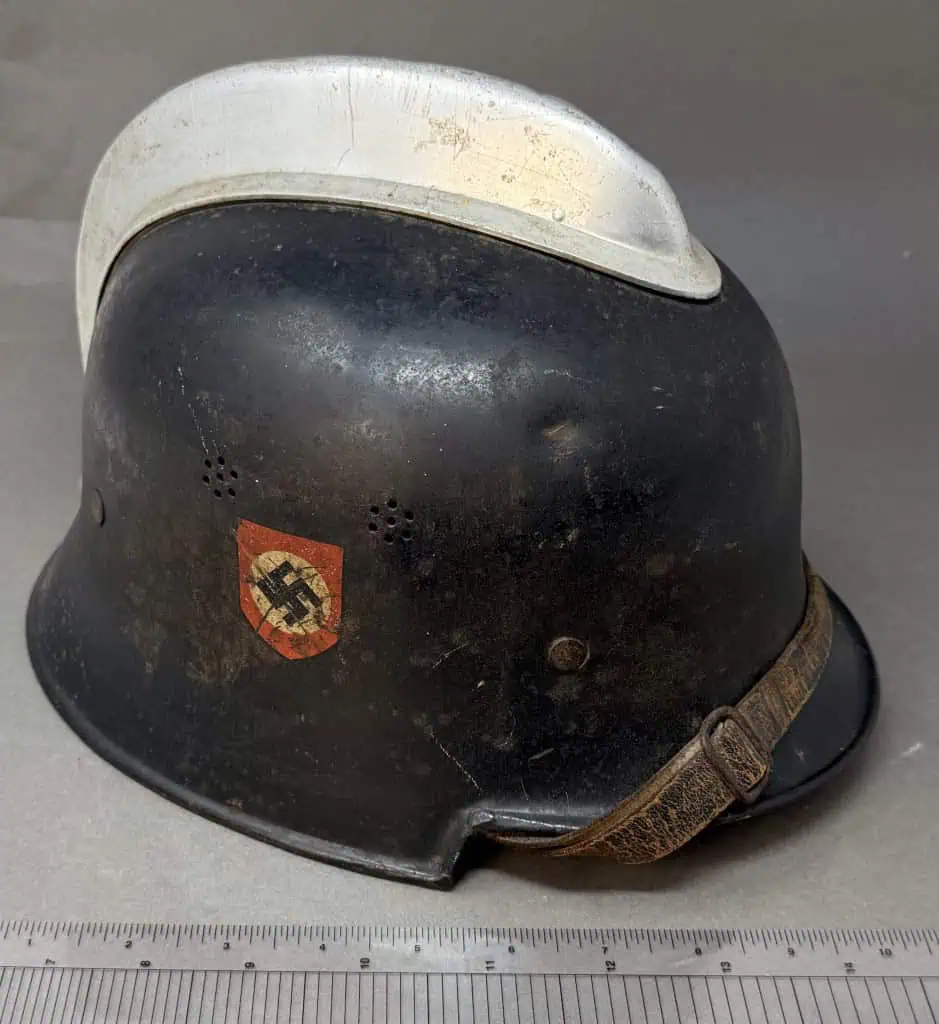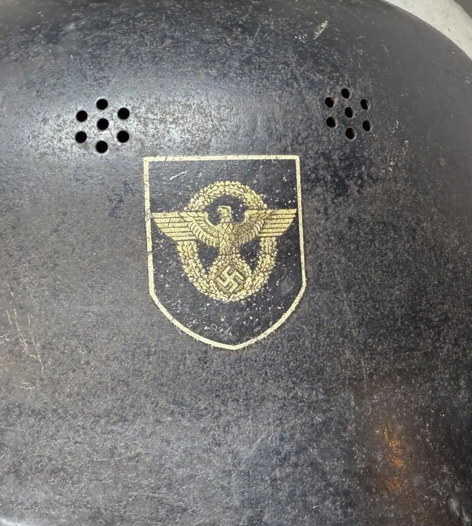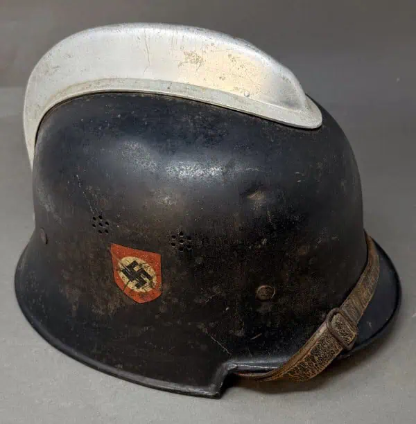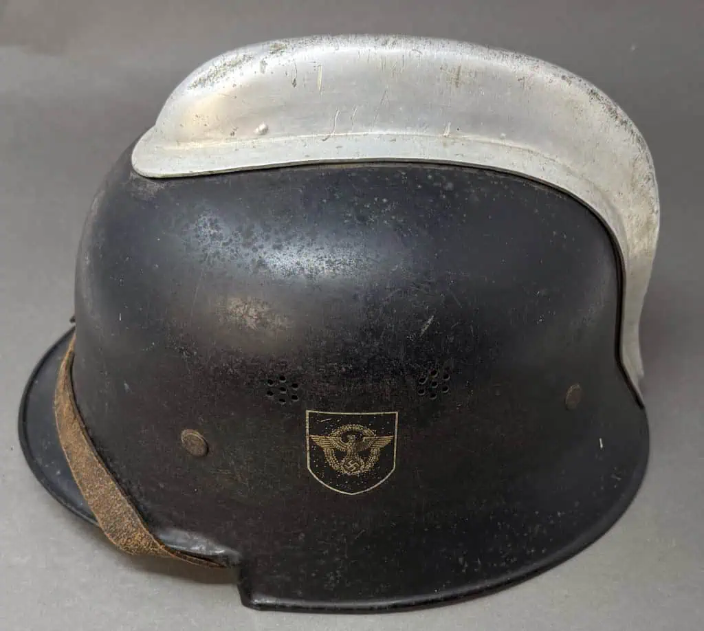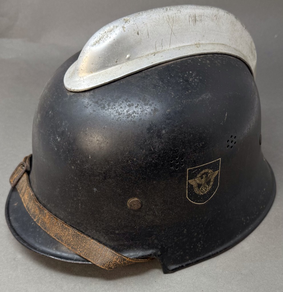 Original WWII German Fire Police DOUBLE DECAL FEUERSCHUTZPOLIZEI HELMET. (Stahlhelm M34) Brought Home By A U.S. Veteran Certified. The stamped aluminum construction, civic M34 “square dip” style helmet retains some of its original black satin finish paint. The left side of the helmet has a, silver bordered, black based, police decal with the ist pattern, silver, police eagle. The right side of the helmet has a party shield decal. The helmet has two separate, groups of seven, “salt & pepper” ventilation holes positioned on each side of the crown. All four of the flat headed liner retaining rivets are intact. The interior of the helmet has a M31 civic style, light tan leather liner. Liner is worn and not complete. Original chinstrap is complete but is broken in one spot. The interior crown has the addition of leather crown lining panel with internal padding.. Has the original nickel plated “comb” on the top. Shows the expected storage age, wear and use. In good but very used condition . Gettysburg Museum Certified (COA) provided. 100% Guaranteed to be authentic brought home by a U.S. Veteran. Sold for historic purposes only. See our other pieces on our web site. Also note when browsing our web site there are several pages of items, at the bottom of the list look for other page numbers. VERY SCARCE EXAMPLE!