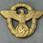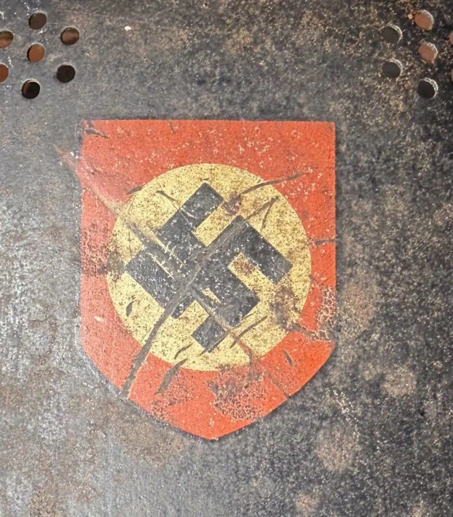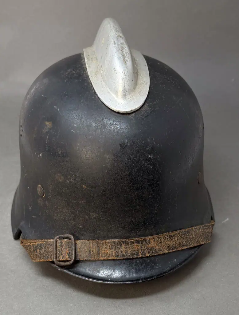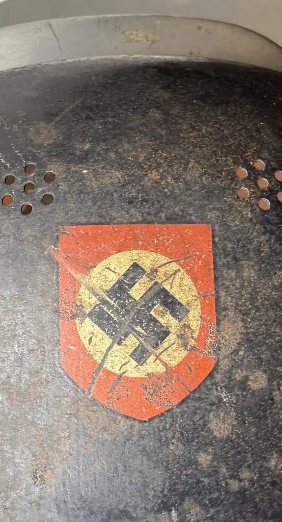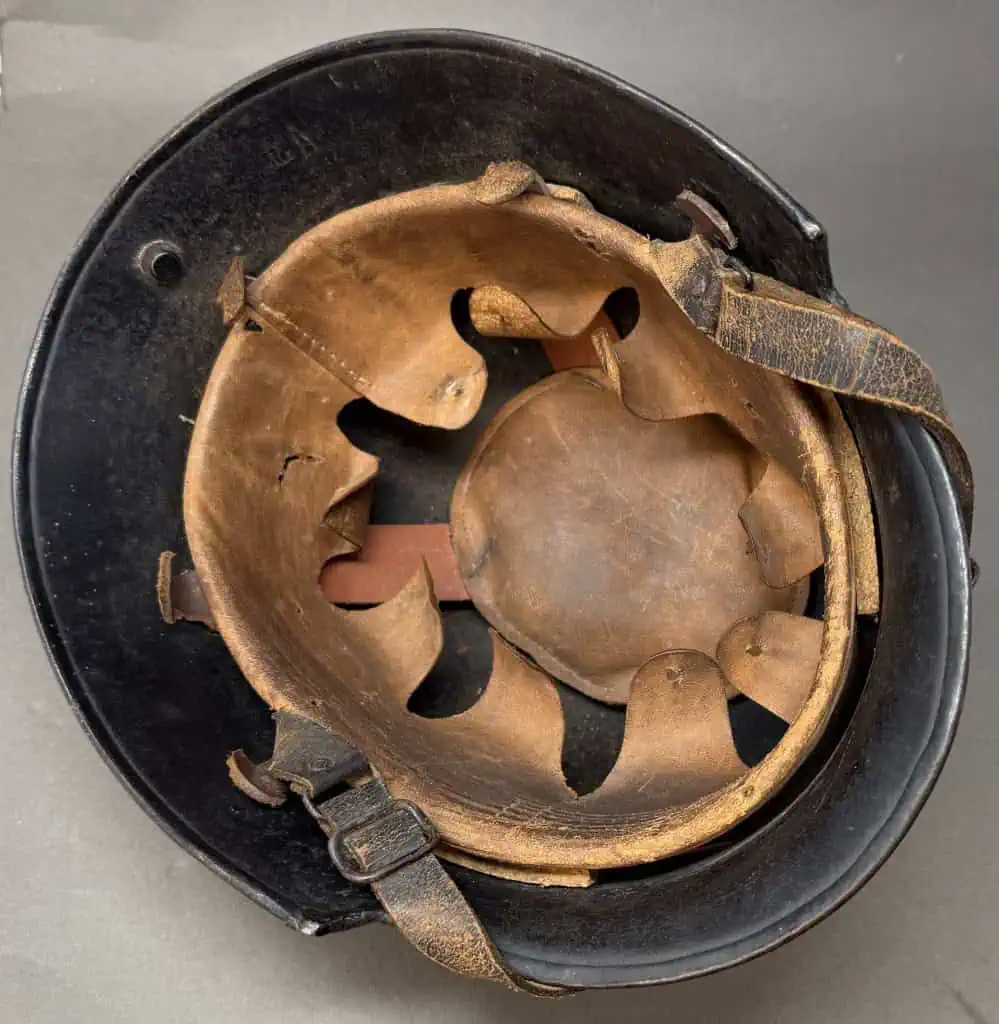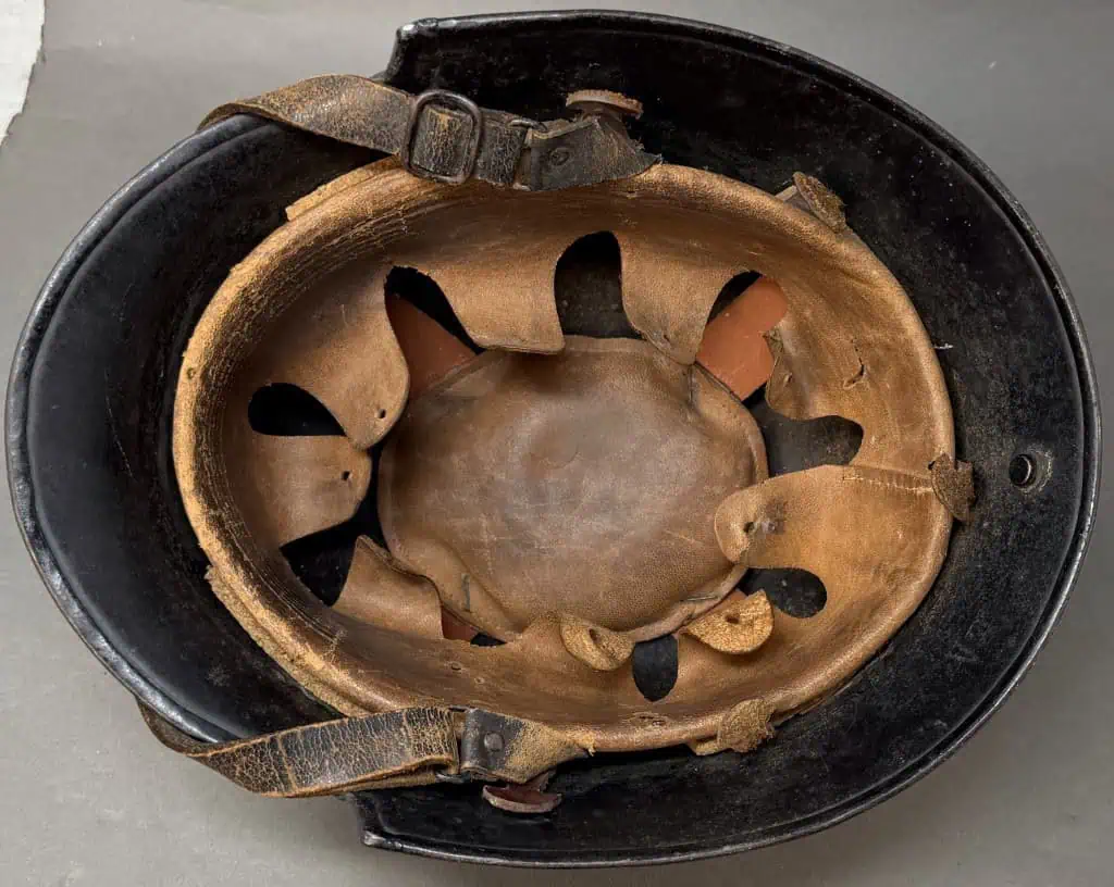 Original WWII German Fire Police DOUBLE DECAL FEUERSCHUTZPOLIZEI HELMET. (Stahlhelm M34) Brought Home By A U.S. Veteran Certified. The stamped aluminum construction, civic M34 “square dip” style helmet retains some of its original black satin finish paint. The left side of the helmet has a, silver bordered, black based, police decal with the ist pattern, silver, police eagle. The right side of the helmet has a party shield decal. The helmet has two separate, groups of seven, “salt & pepper” ventilation holes positioned on each side of the crown. All four of the flat headed liner retaining rivets are intact. The interior of the helmet has a M31 civic style, light tan leather liner. Liner is worn and not complete. Original chinstrap is complete but is broken in one spot. The interior crown has the addition of leather crown lining panel with internal padding.. Has the original nickel plated “comb” on the top. Shows the expected storage age, wear and use. In good but very used condition . Gettysburg Museum Certified (COA) provided. 100% Guaranteed to be authentic brought home by a U.S. Veteran. Sold for historic purposes only. See our other pieces on our web site. Also note when browsing our web site there are several pages of items, at the bottom of the list look for other page numbers. VERY SCARCE EXAMPLE!