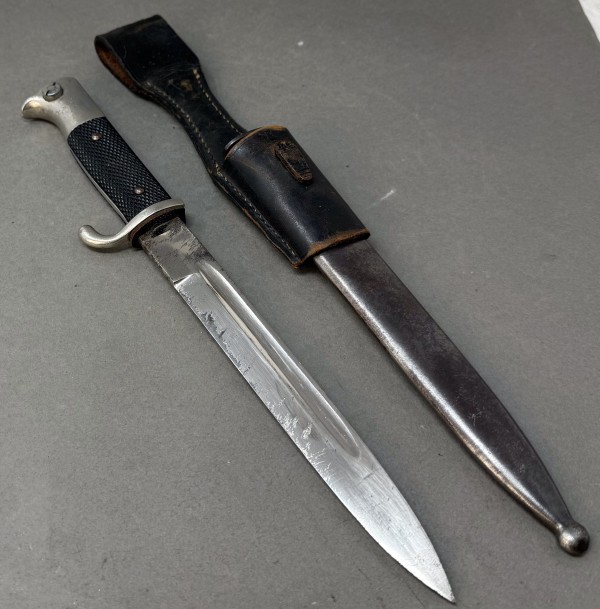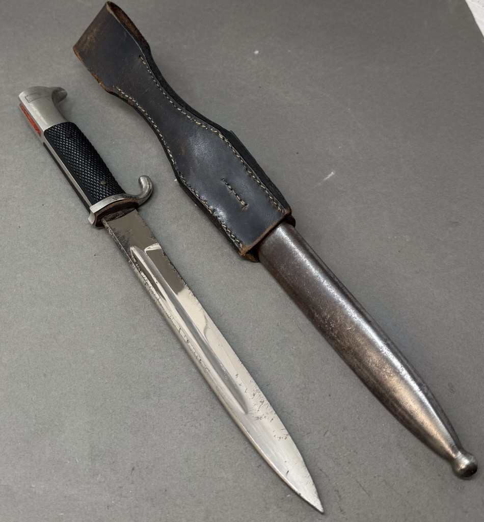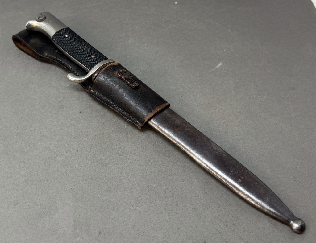 Original WWII German K98 NCO PARADE BAYONET. (Seitengewehr 98K) With leather frog Certified. The K98 bayonet was a modification of the already modified S84/98 bayonet that had been originally developed in 1915. Manufacture of this new modified bayonet began in 1934 with mass production beginning in 1936. The K98 bayonet was a standard issue item and was accompanied by a bayonet frog to be worn on the reverse left side of the weight bearing waist belt. The K98 bayonet remained the standard issue bayonet through-out the war with minor manufacturing variations. As the war continued the quality of the bayonets deteriorated and in mid-1944 most manufacturers discontinued producing the bayonet to concentrate on producing other essential war materials. Roughly 25cm long, drop forged, steel construction nickel plated blade and hardware with wide fullers. Maker marked blade has a great look. Nice checkered  grip. Stud does move and functions properly. Some  loss to the finish on the scabbard. Some scratches on the blade!  The scabbard in good but used condition. This is the shorter Officer/NCO version (scarce). Has original leather frog. Overall great example.  100% Guaranteed to be authentic Complete museum documentation (COA) Provided. Certified by The Gettysburg Museum of History.  Please see our other items. Also note when browsing our web site there are several pages of items, at the bottom of the list look for other page numbers. OUTSTANDING! Do Not Miss This One!
