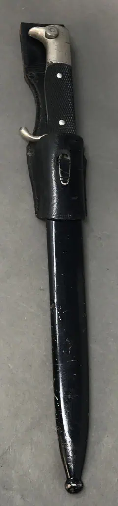 Original WWII German K98 NCO PARADE BAYONET. (Seitengewehr 98K) With leather frog Certified. The K98 bayonet was a modification of the already modified S84/98 bayonet that had been originally developed in 1915. Manufacture of this new modified bayonet began in 1934 with mass production beginning in 1936. The K98 bayonet was a standard issue item and was accompanied by a bayonet frog to be worn on the reverse left side of the weight bearing waist belt. The K98 bayonet remained the standard issue bayonet through-out the war with minor manufacturing variations. As the war continued the quality of the bayonets deteriorated and in mid-1944 most manufacturers discontinued producing the bayonet to concentrate on producing other essential war materials. Roughly 25cm long, drop forged, steel construction nickel plated blade and hardware with wide fullers. Maker marked with “Solingen” Scabbard and blade has a great look. Nice checkered grip. Stud does move and functions properly. Some very slight loss to the finish on the scabbard. VERY nice blade! The scabbard in good but used condition. This is the shorter Officer/NCO version (scarce). Has original leather frog. Overall great example. 100% Guaranteed to be authentic Complete museum documentation (COA) Provided. Certified by The Gettysburg Museum of History. Please see our other items. Also note when browsing our web site there are several pages of items, at the bottom of the list look for other page numbers. OUTSTANDING! Do Not Miss This One!
