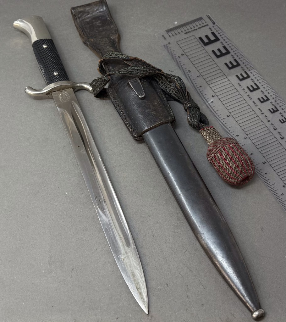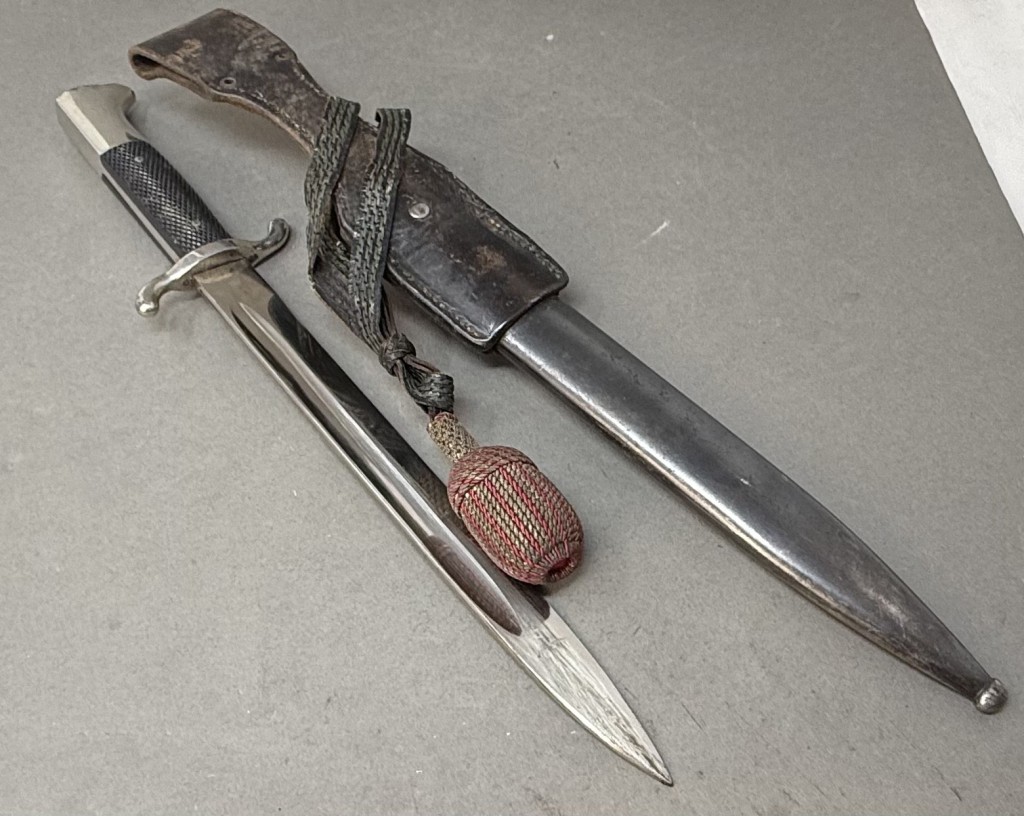 Original WWII German K98 Officer Fire Police PARADE BAYONET. (Seitengewehr 98K) Certified. The K98 bayonet was a modification of the already modified S84/98 bayonet that had been originally developed in 1915. Manufacture of this new modified bayonet began in 1934 with mass production beginning in 1936. The K98 bayonet was a standard issue item and was accompanied by a bayonet frog to be worn on the reverse left side of the weight bearing waist belt. The K98 bayonet remained the standard issue bayonet through-out the war with minor manufacturing variations. As the war continued the quality of the bayonets deteriorated and in mid-1944 most manufacturers discontinued producing the bayonet to concentrate on producing other essential war materials. Roughly 25cm long, drop forged, steel construction nickel plated blade and hardware with wide fullers. Has a great look. Nice checkered grip. No stud and no groove since this was an officer version not to be placed on a rifle but for a side arm for parades. Some very slight loss to the finish on the scabbard. The scabbard in good but used condition. (see Photos) Overall great example. With the original leather frog. and Portepee! 100% Guaranteed to be authentic Complete museum documentation (COA) Provided. Certified by The Gettysburg Museum of History. Please see our other items. Also note when browsing our web site there are several pages of items, at the bottom of the list look for other page numbers. Do Not Miss This One!