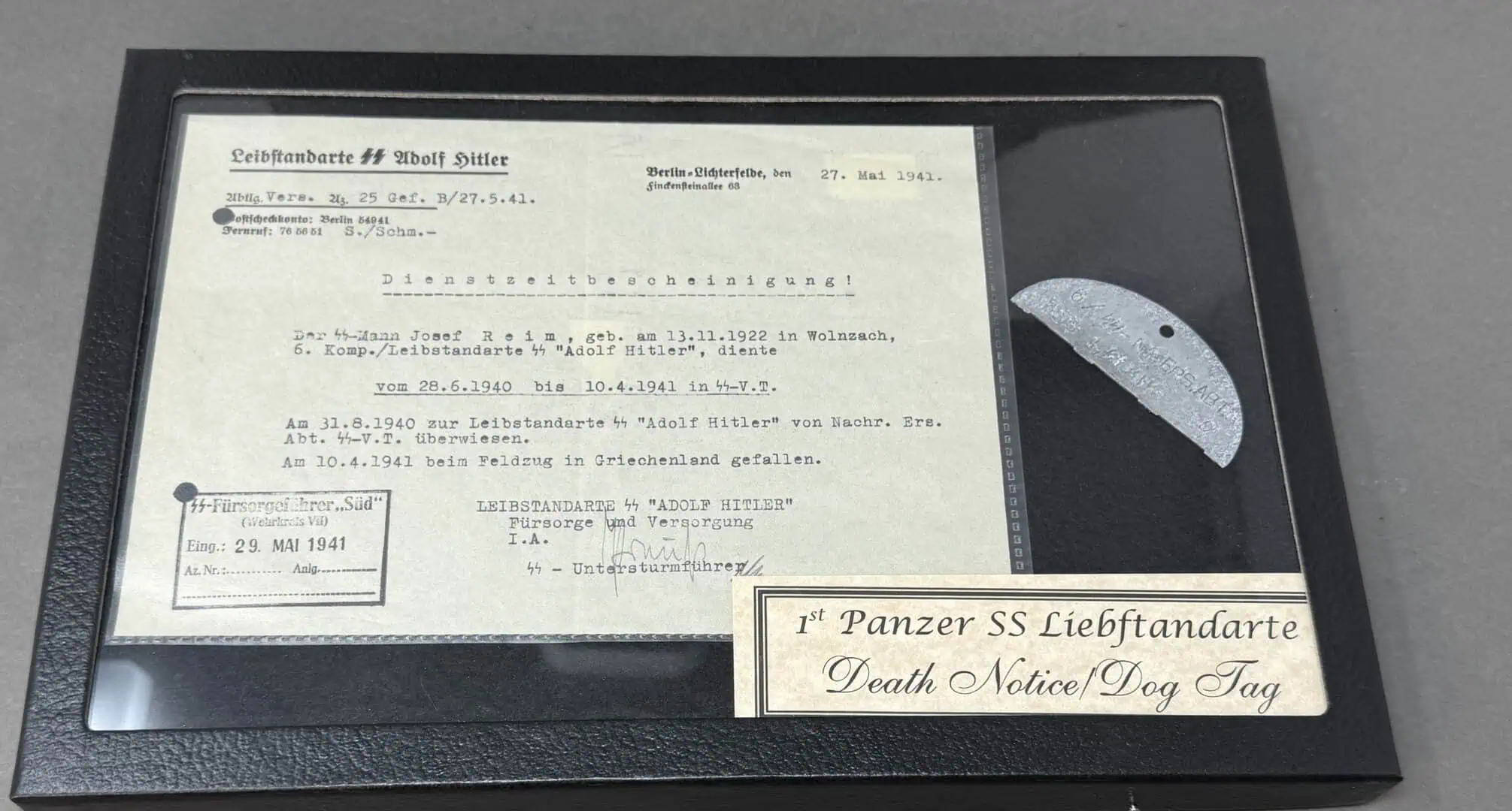 Original WWII German Luftwaffe (Airforce) M40 SINGLE DECAL HELMET. (Stahlhelm M40) Brought Home By A U.S. Veteran Certified. Helmet retains a good portion of its textured Luftwaffe grey paint. Second pattern Luftwaffe eagle decal is also retained about 60%. All three liner retaining rivets intact. M31 tan leather liner has some loss and in used condition (see photos). It still has it’s original tie string! The reverse interior neck guard apron is lot number stamped, and the interior left side apron has stamped manufacturers code and size, “Q64”, indicating manufacture by Quest, size 64. Nice untouched helmet.. Shows the expected age, wear and use. has a name inside the liner see photo. In good but used condition . Gettysburg Museum Certified (COA) provided. 100% Guaranteed to be authentic brought home by a U.S. Veteran. Sold for historic purposes only. See our other pieces on our web site. Also note when browsing our web site there are several pages of items, at the bottom of the list look for other page numbers. OUTSTANDING NICE UNTOUCHED HELMET! Don’t Miss This One! They are really difficult to locate ones this nice!