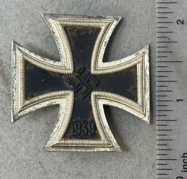 Original WWII German Maker Marked 1939 IRON CROSS 1ST CLASS, 1939. (Eisernes Kreuz I Klasse) Certified. On March 10TH 1813, Prussian King Friedrich Wilhelm III established the Iron Cross as a temporary award for bestowal during times of war. Originally the Iron Cross was introduced in three grades with a Grand Cross intended for award to Senior Commanders for successfully leading troops in combat and the First and Second classes for award to all ranks for bravery or merit in action. The Iron Crosses were re-instituted by King Wilhelm I on July 19TH 1870 for award during the Franco-Prussian War and again on August 5TH 1914 by King Wilhelm II for award during WWI. On September 1ST 1939 Hitler once more re-instituted the Iron Cross series of awards in the First and Second Classes and established the Knight’s Cross of the Iron Cross. The first-class medal was for award to personnel who performed three to five acts of bravery in combat and had already been awarded the Iron Cross 2ND class. Die struck, three-piece, iron and nickel/silver plated alloy construction Patté style cross with a single piece High Quality core and a two-piece alloy frame. The obverse of the award features an embossed, central, canted swastika with the re-institution date, “1939”, to the bottom arm. The swastika is in nice high relief while the date is somewhat lower. With working pinback. In overall good condition with VERY minor storage wear to the medal, see photos. 100% Guaranteed to be authentic, Gettysburg Museum Certified (COA) provided. Maker Marked 15 A VERY NICE EXAMPLE! Good used condition! Don’t miss this! Great looking Iron Cross, one of the classic German Medals!!