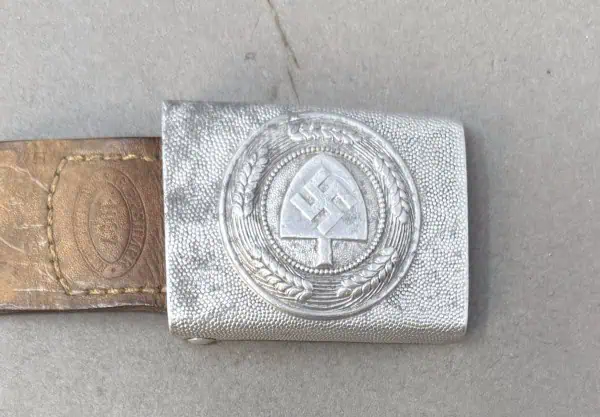 OUTSTANDING Original WWII German RAD EM/NCO’S BELT BUCKLE. (Koppelschloß) WITH MAKER MARKED LEATHER TAB Certified