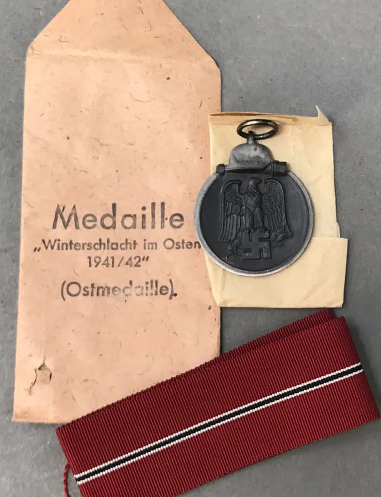 Original WWII German Eastern Front or “Russian Front” Medal With It’s Original Issue Envelope, and Ribbon, . Russian front “frozen Meat Medal” was the slang term for this award. The Russian Front Medal was instituted by Adolf Hitler on May 26TH 1942 to commemorate the first winter campaign in Russia. The award was available to all Wehrmacht personnel, civilians and foreign volunteers who met the required criteria with the main qualification being at least fourteen days of participation in combat on the Russian front. Die struck, alloy construction, medal with a silver washed outer rim and helmet, and a blued center. The obverse of the medal features a recessed outer rim with an embossed helmet and stick grenade to the top center and a high relief Wehrmacht style national eagle with down swept wings, clutching a static swastika in its talons which is superimposed on a laurel leaf sprig to the center. The reverse of the medal features a recessed outer rim with a smooth background field with embossed Latin script to the center, “Winterschlacht Im Osten 1941/42”, (Winter Battle in the East 1941/42), above a crossed sword and laurel leaf sprig. The medal loop and the ribbon suspension ring are both intact. Come with an original issue envelope with paper wrapper and long ribbon section! . in good condition with minor storage wear to the envelope. An untouched German Eastern Front Medal. Gettysburg Museum Certified (COA) provided. Here is an opportunity to obtain a 100% authentic and iconic WWII era German medal that is Museum certified for a reasonable price. Also note when browsing our web site there are several pages of items, at the bottom of the list look for other page numbers. RARE with Envelope! EXCELLENT SET! ALMOST MINT!
