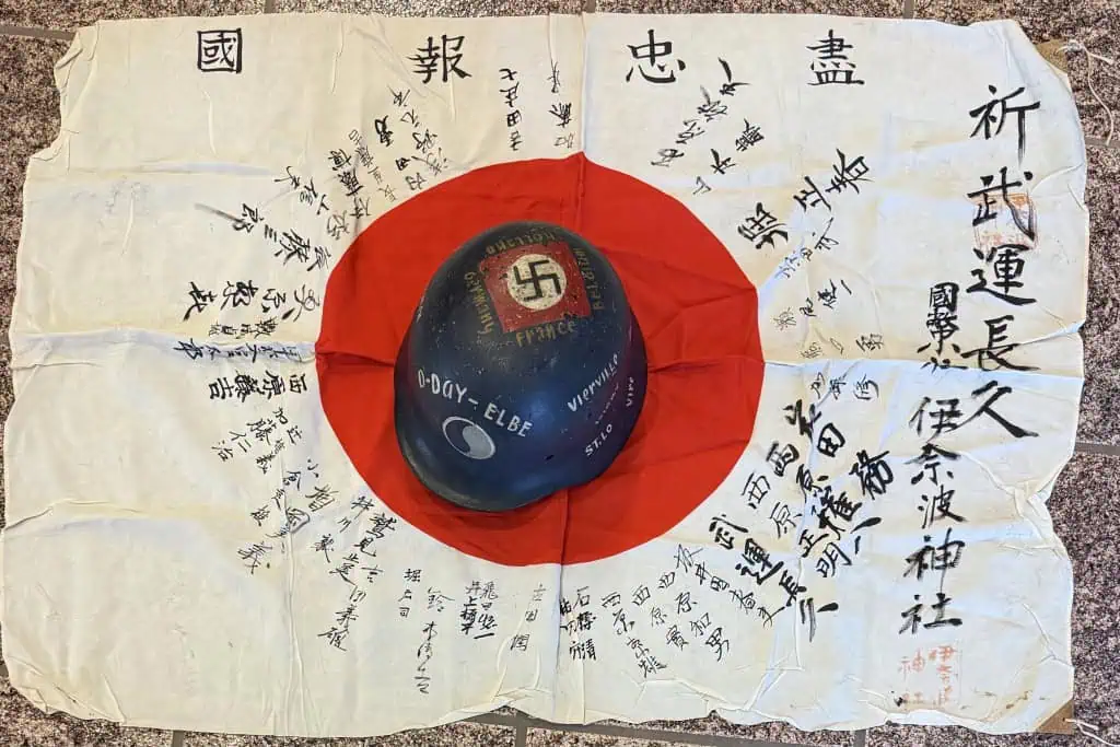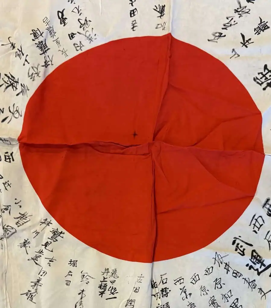 Original WWII Japanese NATIONAL FLAG WITH KANJI And Brought Home By A U.S. Veteran Certified. Most Japanese troops during the second world war carried a personal flag. They had practical as well as patriotic uses, such as marking positions to keep them safe from friendly aircraft while advancing. One piece example is 28cm x 38cm. An approximately 12cm diameter red “Himaru” is screened to the center of the flag’s white field. Handwritten, in black, around the Himaru and on the Himaru are numerous kanji characters. Also has a rare temple stamp! We placed a helmet on it for size reference. A very interesting flag. Shows the expected age and use (see photos) in good (almost mint) a few spots otherwise good condition and it’s very displayable and could be framed and it would look nice. 100% Guaranteed to be authentic and is certified by The Gettysburg Museum Of History and comes with our Museum COA (certificate of authenticity). A rare piece of WWII history. DO NOT MISS THIS!