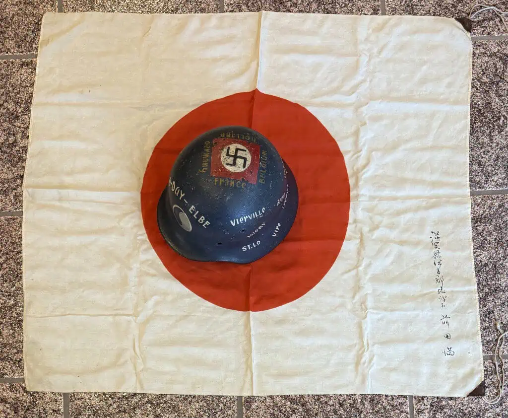 Original WWII Japanese NATIONAL FLAG WITH KANJI And Brought Home By A U.S. Veteran Certified. Most Japanese troops during the second world war carried a personal flag. They had practical as well as patriotic uses, such as marking positions to keep them safe from friendly aircraft while advancing. One piece example is 28cm x 38cm. An approximately 12cm diameter red “Himaru” is screened to the center of the flag’s white field.  Handwritten, in black, around the Himaru and on the Himaru are numerous kanji characters. ! We placed a helmet on it for size reference. A very interesting flag. Shows the expected age (see photos) in good  condition  good  Almost mint condition and it’s very displayable and could be framed and it would look nice. 100% Guaranteed to be authentic and is certified by The Gettysburg Museum Of History and comes with our Museum COA (certificate of authenticity). A rare piece of WWII Japan occupation history. NICE EXAMPLE DO NOT MISS THIS!