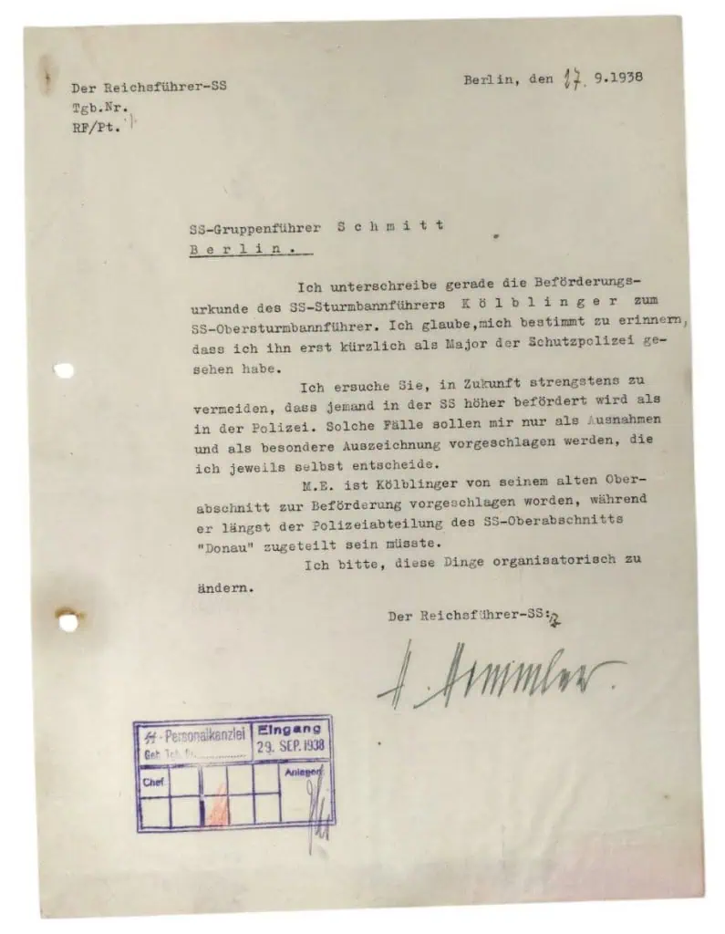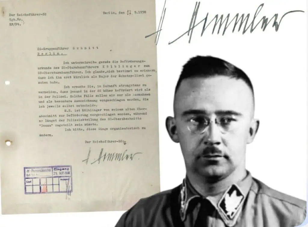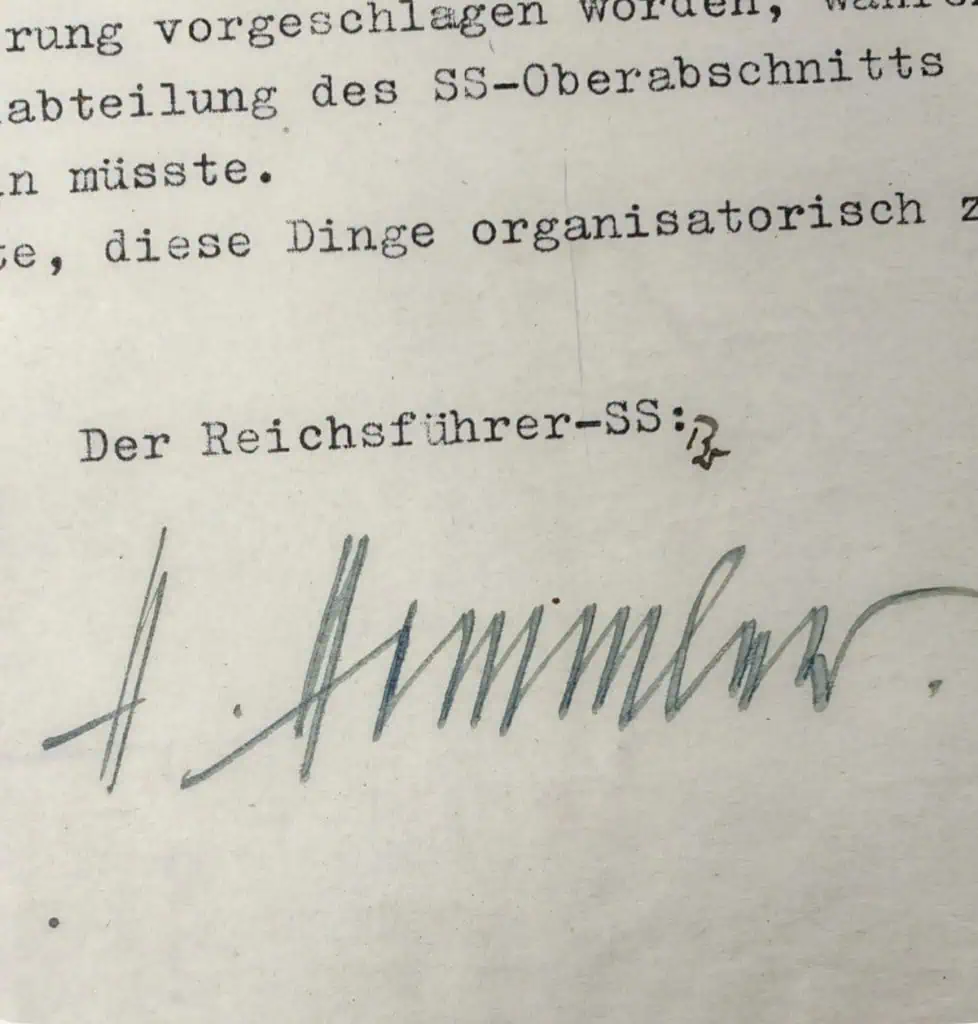 Outstanding VERY HISTORIC Heinrich Himmler Signed (HAND Autographed) On Document Certified. Heinrich Himmler (1900 – 1945) Hitler’s Chief of the SS and Gestapo placed in charge of security and responsible for the construction and operation of extermination camps. He chose suicide rather than face a hangman’s noose at Nuremberg. The Reichsführer-SS File No. RF/Pt. Berlin, 17 September 1938 SS-Group Leader Schmitt Berlin I am just now signing the promotion certificate of SS-Sturmbannführer Kölblinger to SS-Obersturmbannführer. I believe I clearly remember having seen him only recently as a Major of the Protective Police. I request that in the future it be most strictly avoided that anyone in the SS is promoted to a higher rank than in the Police. Such cases are to be submitted to me only as exceptions and only with special justification, and I will decide each case personally. In my opinion, Kölblinger was proposed for promotion by his former SS district, whereas he should long since have been assigned to the Police Department of the SS Upper District “Danube.” Please arrange for these matters to be corrected organizationally. The Reichsführer-SS (signed) Heinrich Himmler ⸻ Personnel Chancellery – Received 29 September 1938, The Himmler signature is VERY LARGE and VERY Dark. Outstanding historical example! 100% Guaranteed to be authentic. Original period SS Himmler signed documents are rare, most were destroyed at the end of WWII. in good condition. Complete museum documentation (COA) Provided. Certified by The Gettysburg Museum of History. The Gettysburg Museum of History does not support or condone Adolf Hitler or the Nazi Party and is only offering this as a historic relic. Please see our other items. Also note when browsing our web site there are several pages of items, at the bottom of the list look for other page numbers. VERY RARE! Don’t miss this one!