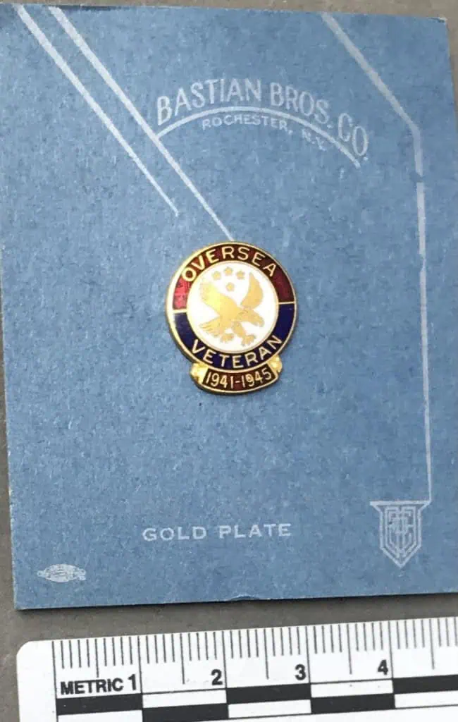 Outstanding WWII U.S. Gold Plated Veteran Badge On Original Card Excellent Example Certified By The Gettysburg Museum Of History. A WWII veteran gold plated badge overseas veteran 1941-1945. screwback badge 100% guaranteed to be authentic with Museum COA. A piece of WWII history. Excellent condition! Don’t miss it!